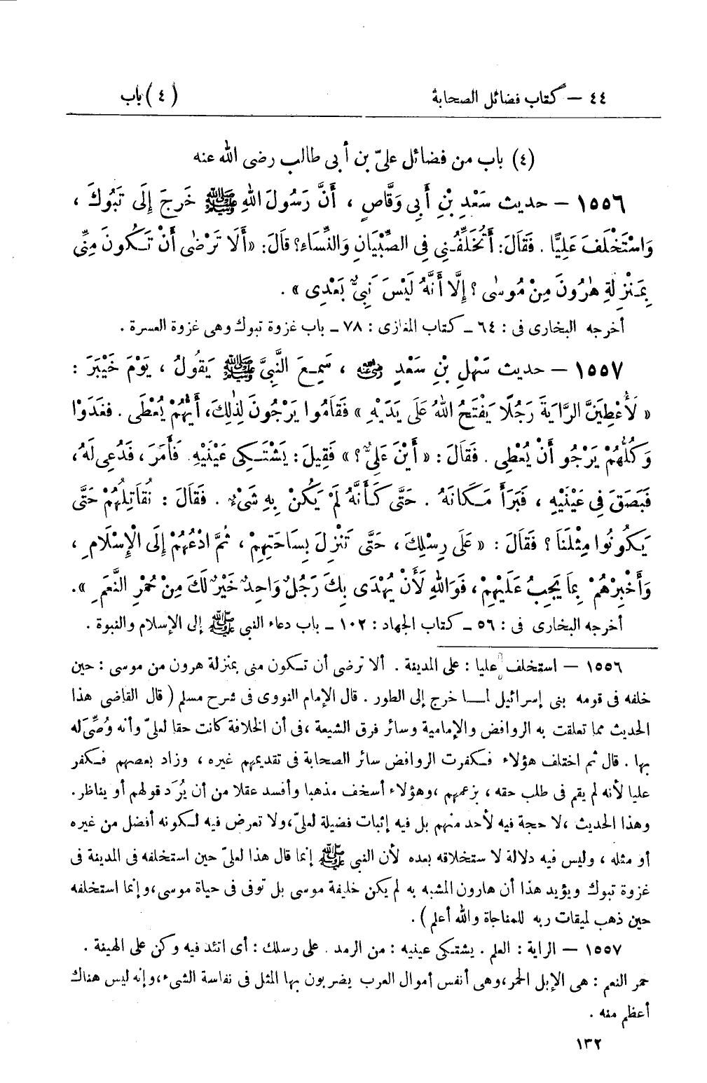 1556 - حديث سَهْلِ بْنِ سَعْدٍ رضي الله عنه، سَمِعَ النَّبِيَّ صَلَّى اللَّهُ عَلَيْهِ وَسَلَّمَ يَقُولُ، يَوْمَ خَيْبَرَ: لأُعْطِيَنَّ الرَّايَةَ رَجُلاً يَفتَحُ اللهُ عَلَى يَديْهِ فَقَامُوا يَرْجُونَ لِذلِكَ، أَيُّهُمْ يُعْطَى فَغَدَوْا وَكُلُّهُمْ يَرْجُو أَنْ يُعْطِي فَقَالَ: أَيْنَ عَلِيٌّ فَقِيلَ: يَشْتَكِي عَيْنَيْهِ فَأَمَرَ، فَدُعِي لَهُ، فَبَصَقَ فِي عَيْنَيْهِ، فَبَرَأَ مَكَانَهُ حَتَّى كَأَنَّهُ لَمْ يَكُنْ بِهِ شَيْءٌ فَقَالَ: نقَاتِلُهُمْ حَتَّى يَكُونُوا مِثْلَنَا فَقَالَ: عَلَى رِسْلِكَ، حَتَّى تَنْزِلَ بِسَاحَتِهِمْ، ثُمَّ ادْعُهُمْ إِلَى الإِسْلاَمِ، وَأَخْبِرْهُمْ بِمَا يَجِبُ عَلَيْهِمْ، فَوَاللهِ لأَنْ يُهْدَى بِكَ رَجُلٌ وَاحِدٌ خَيْرٌ لَكَ مِنْ حُمْرِ النَّعَمِ