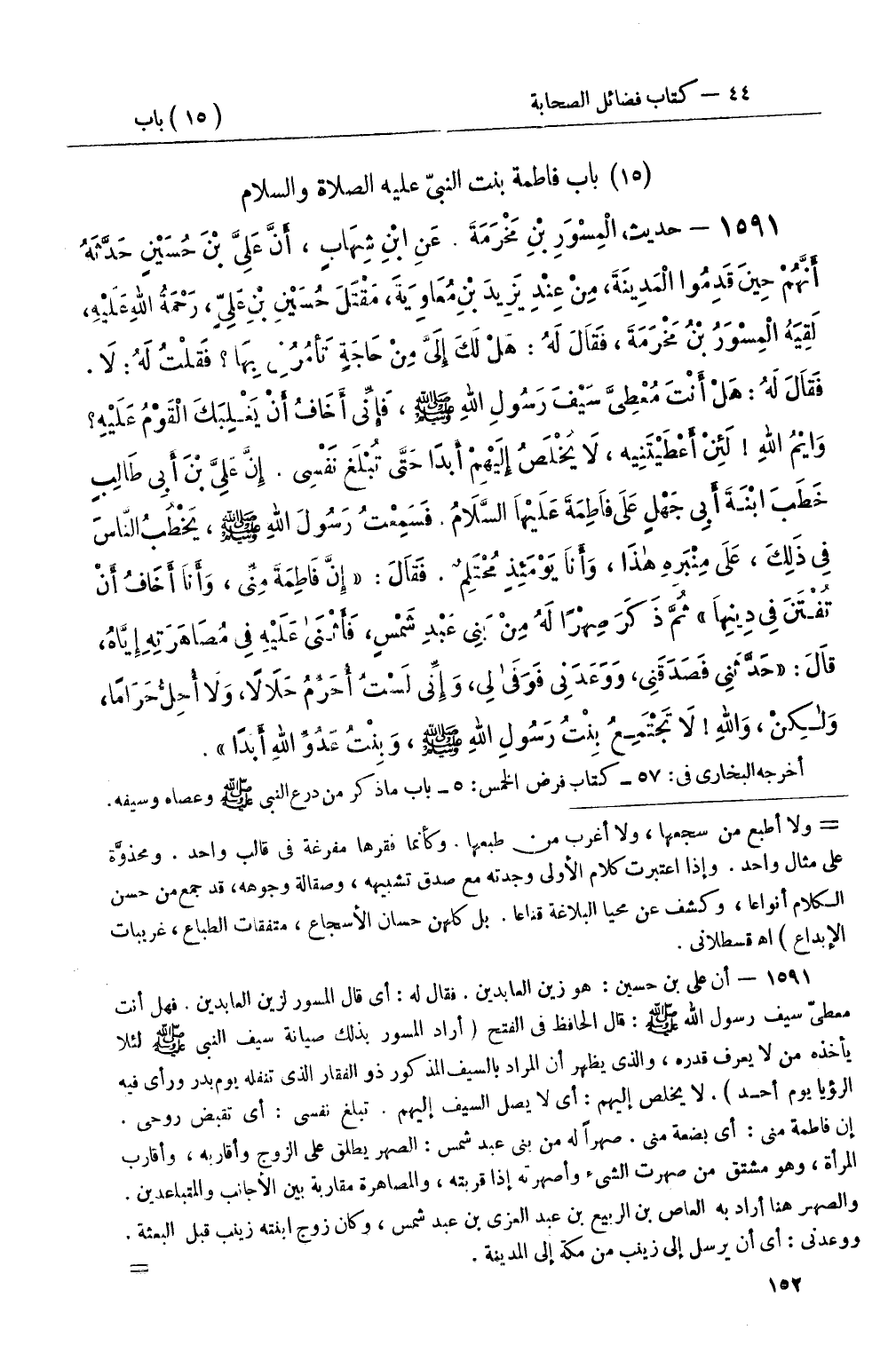 1591 - حديث الْمِسْوَرِ بْنِ مَخْرَمَةَ عَنِ ابْنِ شِهَابٍ، أَنَّ عَلِيَّ بْنَ حُسَيْنٍ حَدَّثَهُ أَنَّهُمْ حِينَ قَدِمُوا الْمَدِينَةَ، مِنْ عِنْدِ يَزِيدَ بْنِ مُعَاوِيَةَ، مَقْتَلَ حُسَيْنِ بْنِ عَلَيٍّ، رَحْمَةُ اللهِ عَلَيْهِ، لَقِيَهُ الْمِسْوَرُ بْنُ مَخْرَمَةَ، فَقَالَ لَهُ: هَلْ لَكَ إِلَيَّ مِنْ حَاجَةٍ تَأْمُرُنِي بِهَا فَقُلْتُ لَهُ: لاَ فَقَالَ لَهُ: هَلْ أَنْتَ مُعْطِيَّ سَيْفَ رَسُولِ اللهِ صَلَّى اللَّهُ عَلَيْهِ وَسَلَّمَ، فَإِنِّي أَخَافُ أَنْ يَغْلِبَكَ الْقَوْمُ عَلَيْهِ وَايْمُ اللهِ لَئِنْ أَعْطَيْتَنِيهِ، لاَ يُخْلَصُ إِلَيْهِمْ أَبدًا حَتَّى تُبْلَغَ نَفْسِي إِنَّ عَلِيَّ بْنَ أَبِي طَالِبٍ خَطَبَ ابْنَةَ أَبِي جَهْلٍ عَلَى فَاطِمَةَ عَلَيْهَا السَّلاَمُ فَسَمِعْتُ رَسُولَ اللهِ صَلَّى اللَّهُ عَلَيْهِ وَسَلَّمَ، يَخْطُبُ النَّاسَ فِي ذَلِكَ، عَلَى مِنْبَرِهِ هذَا، وَأَنَا يَوْمَئِذٍ مُحْتَلِمٌ فَقَالَ: إِنَّ فَاطِمَةَ مِنِّي، وَأَنَا أَخَافُ أَنْ تُفْتَنَ فِي دِينِهَا ثُمَّ ذَكَرَ صِهْرًا لَهُ مِنْ بَنِي عَبْدِ شَمْسٍ، فَأَثْنَى عَلَيْهِ فِي مُصَاهَرَتِهِ إِيَّاهُ، قَالَ: حَدَّثَنِي فَصَدَقَنِي، وَوَعَدَنِي فَوَفَى لِي، وَإِنِّي لَسْتُ أُحَرِّمُ حَلاَلاً، وَلاَ أُحِلُّ حَرَامًا، وَلكِنْ، وَاللهِ لاَ تَجْتَمِعُ بِنْتُ رَسُولِ اللهِ صَلَّى اللَّهُ عَلَيْهِ وَسَلَّمَ، وَبِنْتُ عَدُوِّ اللهِ أَبَدًا