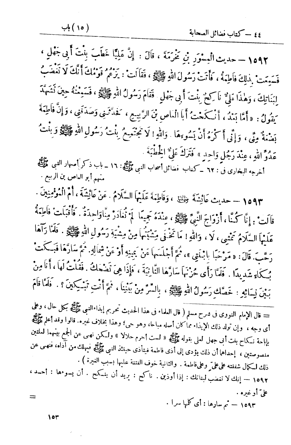 1592 - حديث الْمِسْوَرِ بْنِ مَخْرَمَةَ، قَالَ: إِنَّ عَلِيًّا خَطَبَ بِنْتَ أَبِي جَهْلٍ، فَسَمِعَتْ بِذَلِكَ فَاطِمَةُ، فَأَتَتْ رَسُولَ اللهِ صَلَّى اللَّهُ عَلَيْهِ وَسَلَّمَ، فَقَالَتْ: يَزْعُمُ قَوْمُكَ أَنَّكَ لاَ تَغْضَبُ لِبَنَاتِكَ، وَهذَا عَلِيٌّ نَاكِحٌ بِنْتَ أَبِي جَهْلٍ فَقَامَ رَسُولُ اللهِ صَلَّى اللَّهُ عَلَيْهِ وَسَلَّمَ، فَسَمِعْتُهُ حِينَ تَشَهَّدَ يَقُولُ: أَمَّا بَعْدُ، أَنْكَحْتُ أَبَا الْعَاصِ بْنَ الرَّبِيعِ، فَحدَّثَنِي وَصَدَقَنِي، وَإِنَّ فَاطِمَةَ بَضْعَةٌ مِنِّي، وَإِنِّي أَكْرَهُ أَنْ يَسُوءَهَا وَاللهِ لاَ تَجْتَمِعُ بِنْتُ رَسُولِ اللهِ صَلَّى اللَّهُ عَلَيْهِ وَسَلَّمَ وَبِنْتُ عَدُوِّ اللهِ، عِنْدَ رَجُلٍ وَاحِدٍ فَتَرَكَ عَلِيٌّ الْخِطْبَةَ