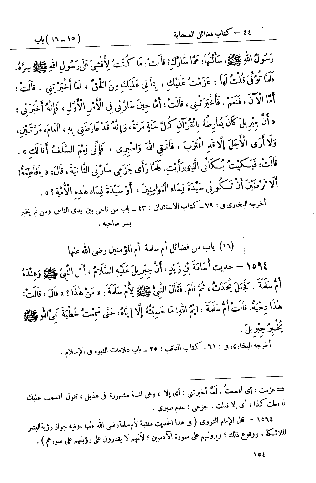 1594 - حديث أُسَامَةَ بْنِ زَيْدٍ، أَنَّ جَبْرِيلَ عَلَيْهِ السَّلاَمُ، أَتَى النَّبِيَّ صَلَّى اللَّهُ عَلَيْهِ وَسَلَّمَ وَعِنْدَهُ أُمُّ سَلَمَةَ فَجَعَلَ يُحَدِّثُ، ثُمَّ قَامَ فَقَالَ النَّبِيُّ صَلَّى اللَّهُ عَلَيْهِ وَسَلَّمَ لأُمِّ سَلَمَةَ: مَنْ هذَا قَالَ، قَالَتْ: هذَا دِحْيَةُ قَالَتْ أُمُّ سَلَمَةَ: ايْمُ اللهِ مَا حَسِبْتُهُ إِلاَّ إِيَّاهُ، حَتَّى سَمِعْتُ خُطْبَةَ نَبِيِّ اللهِ صَلَّى اللَّهُ عَلَيْهِ وَسَلَّمَ يُخْبِرُ جِبْرِيلَ