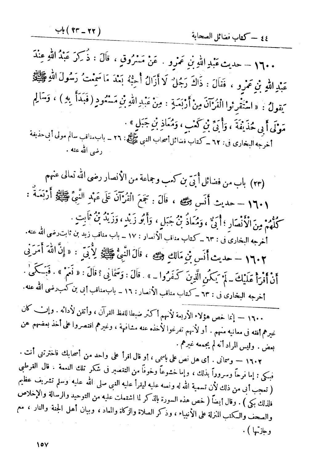 1600 - حديث عَبْدِ اللهِ بْنِ عَمْرٍو عَنْ مَسْرُوقٍ، قَالَ: ذُكِرَ عَبْدُ اللهِ عِنْدَ عَبْدِ اللهِ بْنِ عَمْرٍو، فَقَالَ: ذَاكَ رَجُلٌ لاَ أَزَالُ أُحِبُّهُ بَعْدَ مَا سَمِعْتُ رَسُولَ اللهِ صَلَّى اللَّهُ عَلَيْهِ وَسَلَّمَ يَقولُ: اسْتَقْرِئوا الْقُرْآنَ مِنْ أَرْبَعَةٍ: مِنْ عَبْدِ اللهِ مَسْعُودٍ (فَبَدَأَ بِهِ) ، وَسَالِم مَوْلَى أَبِي حُذَيْفَةَ، وَأُبَيِّ بْنِ كَعْبٍ، وَمُعَاذِ بْنِ جَبَلٍ