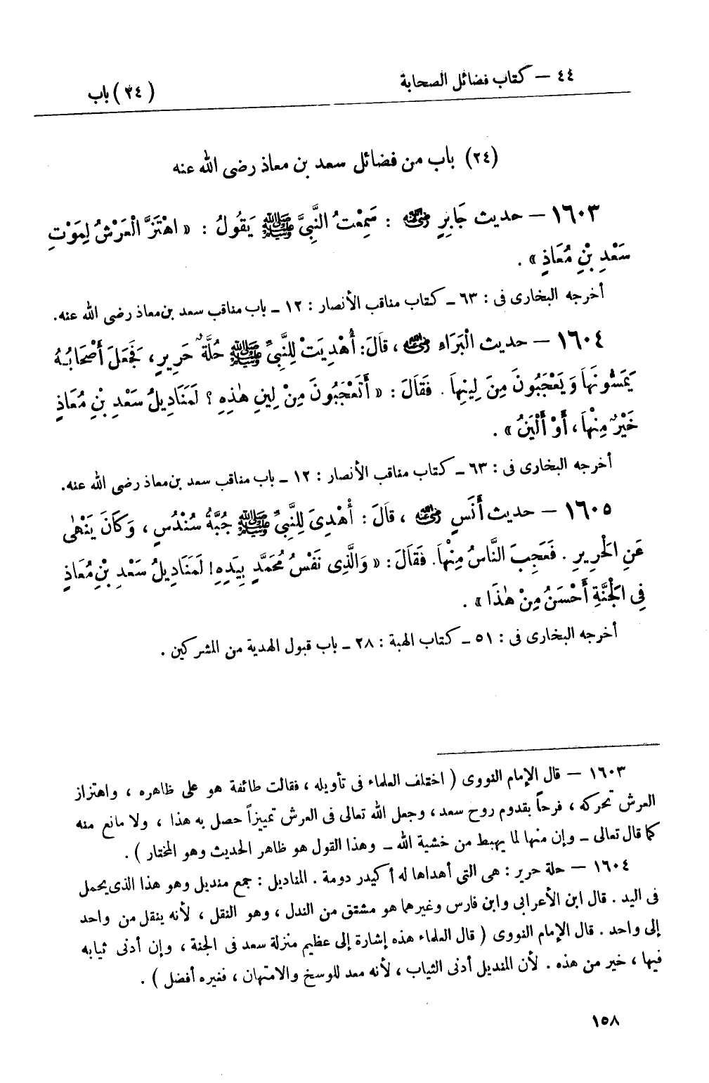 1603 - حديث جَابِرٍ رضي الله عنه: سَمِعْتُ النَّبِيَّ صَلَّى اللَّهُ عَلَيْهِ وَسَلَّمَ يَقُولُ: اهْتَزَّ الْعَرْشُ لِمَوْتِ سَعْدِ بْنِ مُعَاذٍ