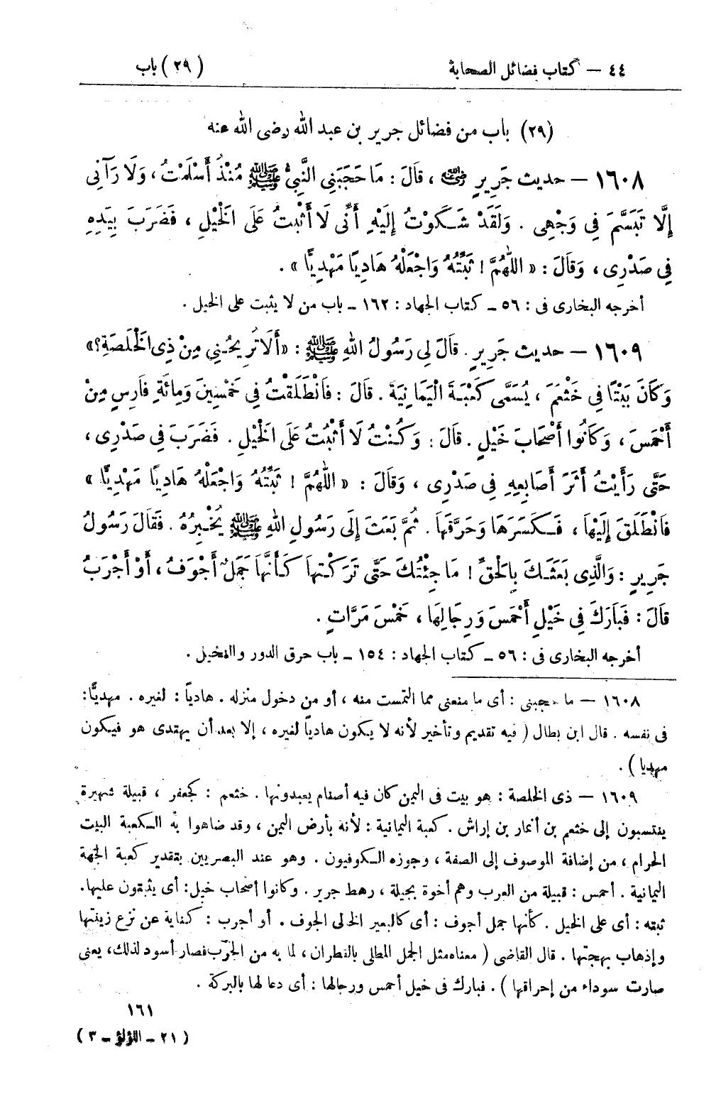1608 - حديث جَرِيرٍ رضي الله عنه، قَالَ: مَا حَجَبَنِي النَّبِيُّ صَلَّى اللَّهُ عَلَيْهِ وَسَلَّمَ مُنْذُ أَسْلَمْتُ، وَلاَ رَآنِي إِلاَّ تَبَسَّمَ فِي وَجْهِي وَلَقَدْ شَكَوْتُ إِلَيْهِ أَنِّي لاَ أَثْبُتُ عَلَى الْخَيْلِ، فَضَرَبَ بِيَدِهِ فِي صَدْرِي، وَقَالَ: اللهُمَّ ثَبِّتْهُ وَاجْعَلْهُ هَادِيًا مَهْدِيًّا