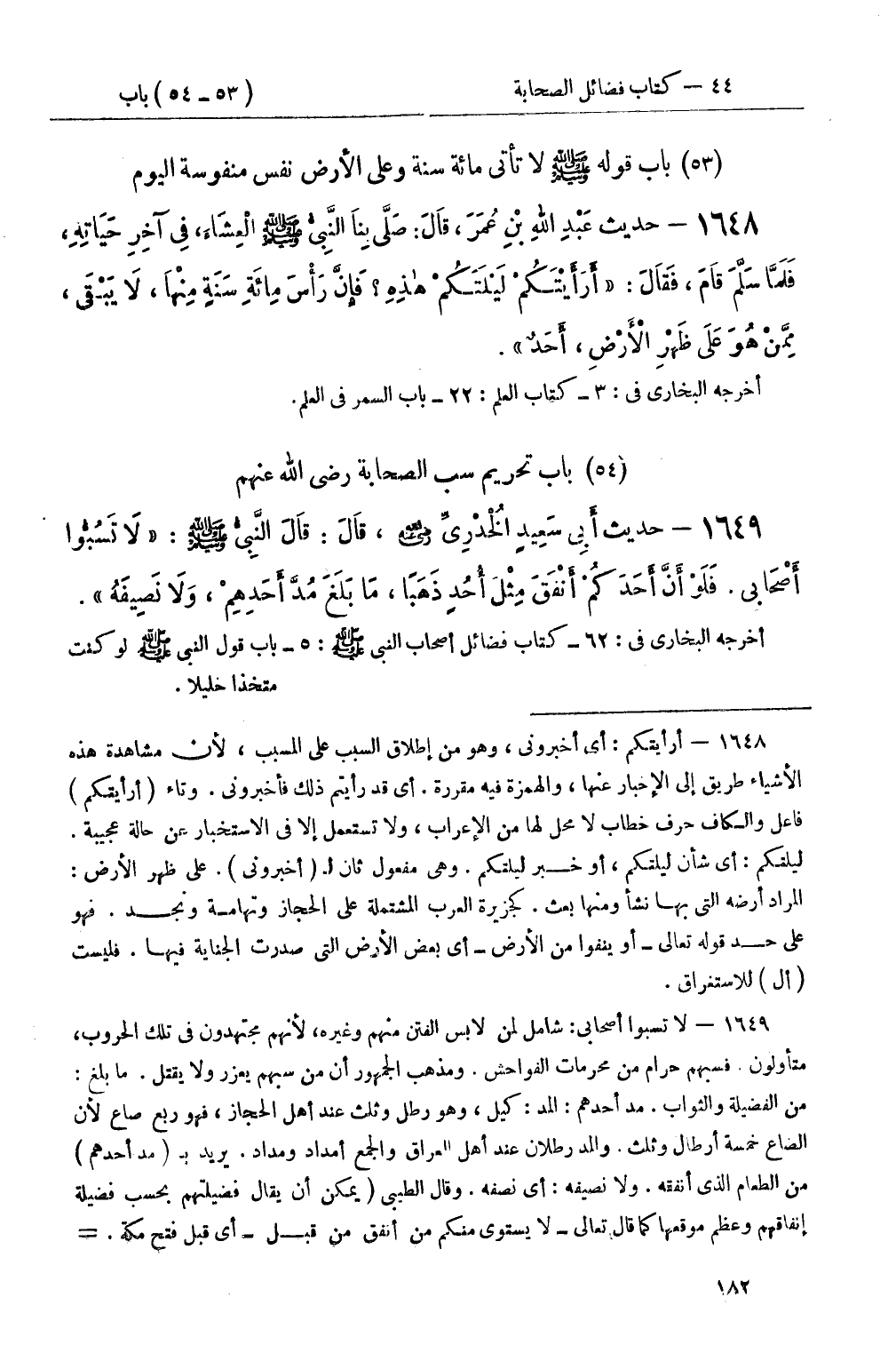1649 - حَدِيثُ أَبِي سَعِيدٍ الخُدْرِيِّ رضي الله عنه، قَالَ: قَالَ النَّبِيُّ صَلَّى اللَّهُ عَلَيْهِ وَسَلَّمَ: «لاَ تَسُبُّوا أَصْحَابي. فَلَوْ أَنَّ أَحَدَكُمْ أَنْفَقَ مِثْل أُحُدٍ ذَهَباً، مَا بَلَغَ مُدَّ أَحَدِهِمْ، وَلاَ نَصِيفَه» .