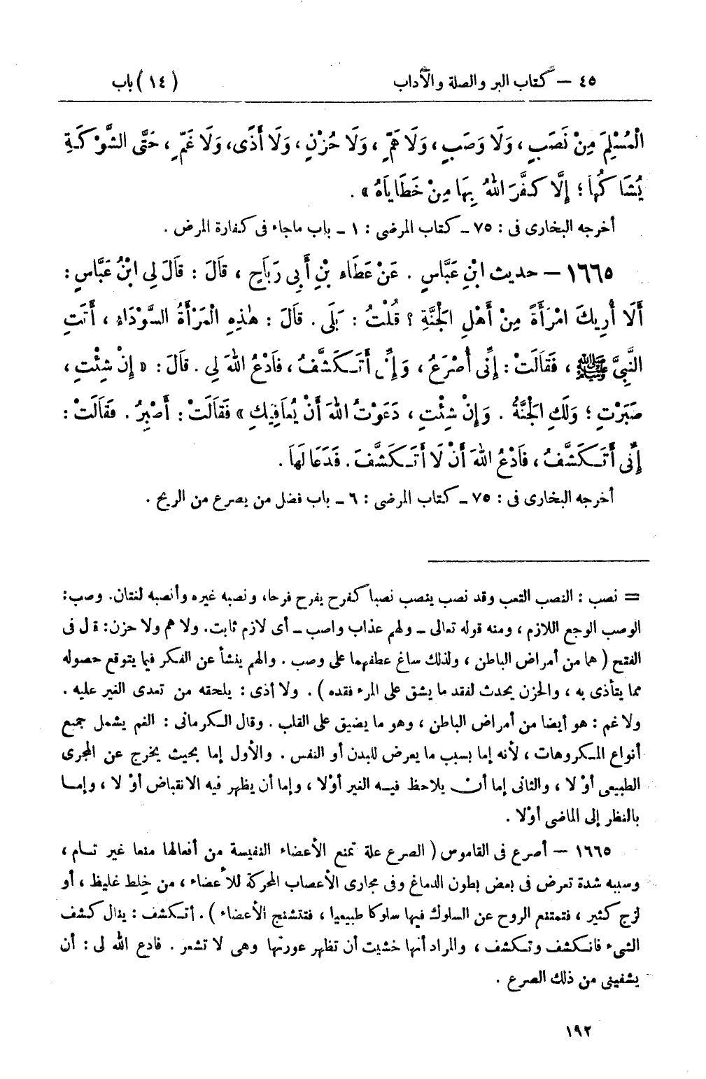 1665 - حَدِيثُ ابْنِ عَبَّاسٍ. عَنْ عَطَاءِ بْنِ أَبِي رَبَاحٍ، قَالَ: قَالَ لِي ابْنُ عَبَّاسٍ: أَلاَ أُرِيكَ امْرَأَةً مِنْ أَهْلِ الجَنَّةِ؟ قُلْتُ: بَلَى. قَالَ: هاذِهِ المَرْأَةُ السَّوْدَاءُ، أَتَتِ النَّبِيَّ صَلَّى اللَّهُ عَلَيْهِ وَسَلَّمَ، فَقَلَتْ: إِنِّي أُصْرَعُ، وَإِنِّي أَتكَشَّفُ، فَادْعُ الله لِي. قَالَ: «إِنْ شِئْتِ، صَبَرْتِ؛ وَلَكِ الجَنَّةُ. وَإِنْ شِئْتِ، دَعَوْتُ الله أَنْ يُعَافِيكِ» فَقَالَتْ: أَصْبِرُ. فَقَالَتْ: إِنِّي أَتكَشَّفُ: فَادْعُ الله أَنْ لاَ أَتكَشَّفَ. فَدَعَا لَهَا.