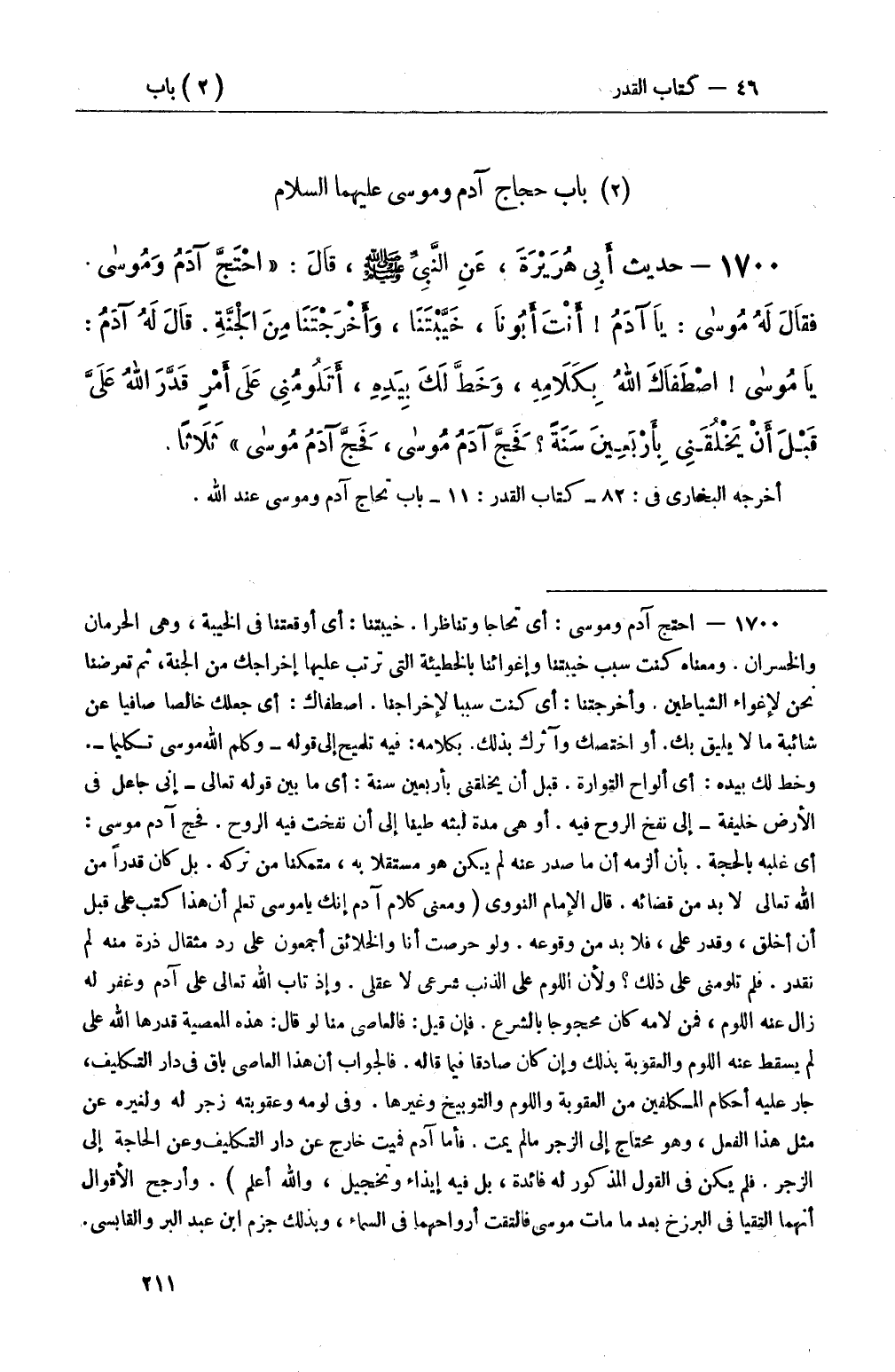 1700 - حديث أَبِي هُرَيْرَةَ، عَنِ النَّبِيِّ صَلَّى اللَّهُ عَلَيْهِ وَسَلَّمَ، قَالَ: احْتَجَّ آدَمُ وَمُوسى فَقَالَ لَهُ مُوسى: يَا آدَمُ أَنْتَ أَبُونَا، خَيَّبْتَنَا، وَأَخْرَجْتَنَا مِنَ الْجَنَّةِ قَالَ لَهُ آدَمُ: يَا مُوسى اصْطَفَاكَ اللهُ بِكَلاَمِهِ، وَخَطَّ لَكَ بِيَدِهِ، أَتَلُومُنِي عَلَى أَمْرٍ قَدَّرَ اللهُ عَلَيَّ قَبْلَ أَنْ يَخْلُقَنِي بِأَرْبَعِينَ سَنَةً فَحَجَّ آدَمُ مُوسى ثَلاَثًا
