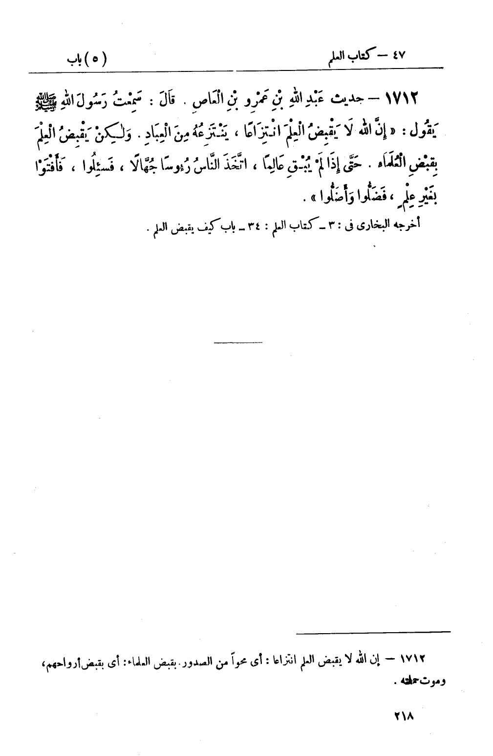 1712 - حديث عَبْدِ اللهِ بْنِ عَمْرِو بْنِ الْعَاصِ قَالَ: سَمِعْتُ رَسُولَ اللهِ صَلَّى اللَّهُ عَلَيْهِ وَسَلَّمَ يَقُول: إِنَّ الله لاَ يَقْبِضُ الْعِلْمَ انْتِزَاعًا، يَنْتَزِعُهُ مِنَ الْعِبَادِ وَلكِنْ يَقْبِضُ الْعِلْمَ بِقبْضِ الْعُلَمَاءِ حَتَّى إِذَا لَمْ يُبْقِ عَالِمًا، اتَّخَذَ النَّاسُ رُءُوسًا جُهَّالاً، فَسُئِلُوا، فَأَفْتَوْا بغَيْرِ عِلْمٍ، فَضَلُّوا وَأَضَلُّوا