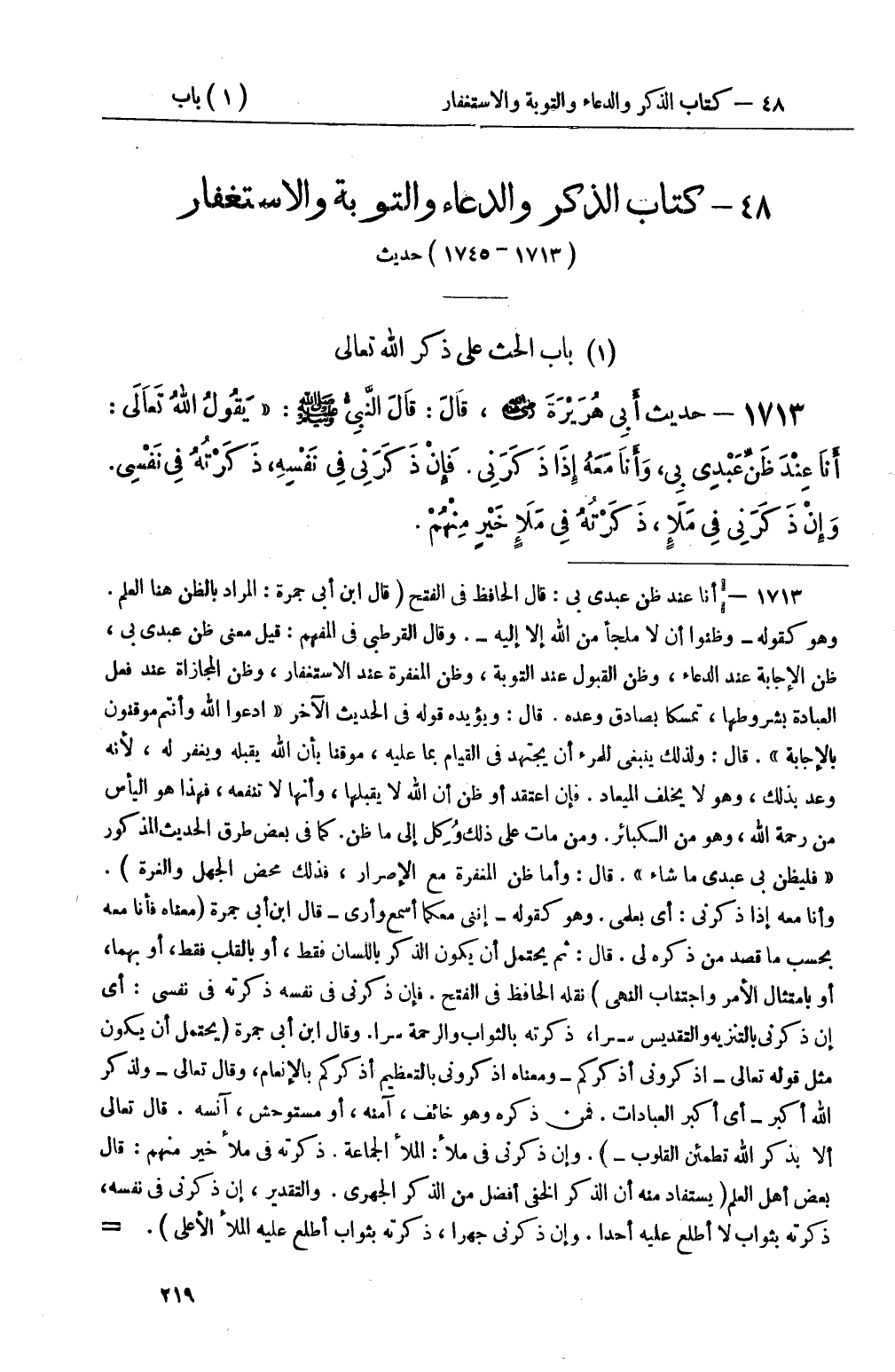 1713 - حديث أَبِي هُرَيْرَةَ رضي الله عنه، قَالَ: قَالَ النَّبِيُّ صَلَّى اللَّهُ عَلَيْهِ وَسَلَّمَ: يَقُولُ اللهُ تَعَالَى: أَنَا عِنْدَ ظَنِّ عَبْدِي بِي، وَأَنَا مَعَهُ إِذَا ذَكَرَنِي فَإِنْ ذَكَرَنِي فِي نَفْسِهِ، ذَكَرْتُهُ فِي نَفْسِي وَإِنْ ذَكَرَنِي فِي مَلإٍ، ذَكَرْتُهُ فِي مَلإٍ خَيْرٍ مِنْهُمْ -[220]- وَإِنْ تَقَرَّبَ إِلَيَّ بِشِبْرٍ، تَقَرَّبْتُ إِلَيْهِ ذِرَاعًا وَإِنْ تَقَرَّبَ إِلَيَّ ذِرَاعًا، تَقَرَّبْتُ إِلَيْهِ بَاعًا وَإِنْ أَتَانِي يَمْشِي، أَتَيْتُهُ هَرْوَلَةً