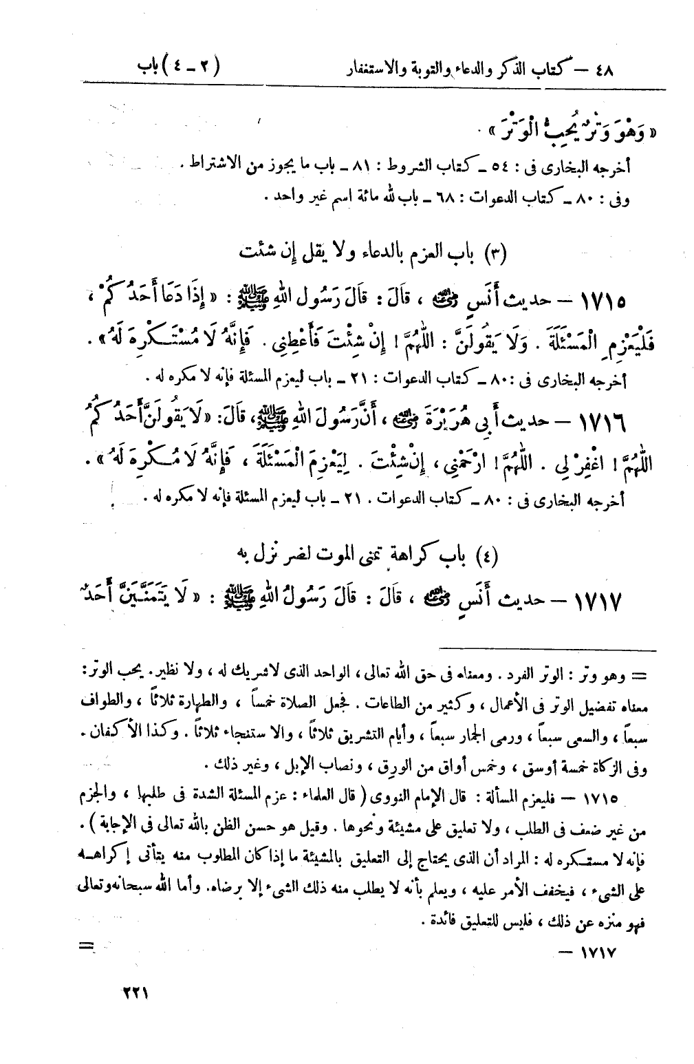 1717 - حديث أَنَسٍ رضي الله عنه، قَالَ: قَالَ رَسُولُ اللهِ صَلَّى اللَّهُ عَلَيْهِ وَسَلَّمَ: لاَ يَتَمَنَّيَنَّ أَحَدٌ -[222]- مِنْكُمُ الْمَوْتَ لِضُرٍّ نَزَلَ بِهِ فَإِنْ كَانَ لاَ بُدَّ مُتَمَنِّيًا لِلْمَوْتِ، فَلْيَقُلِ اللهُمَّ أَحْيِنِي مَا كَانَتِ الْحَيَاةُ خَيْرًا لِي وَتَوَفَّنِي إِذَا كَانَتِ الْوَفَاةُ خَيْرًا لِي