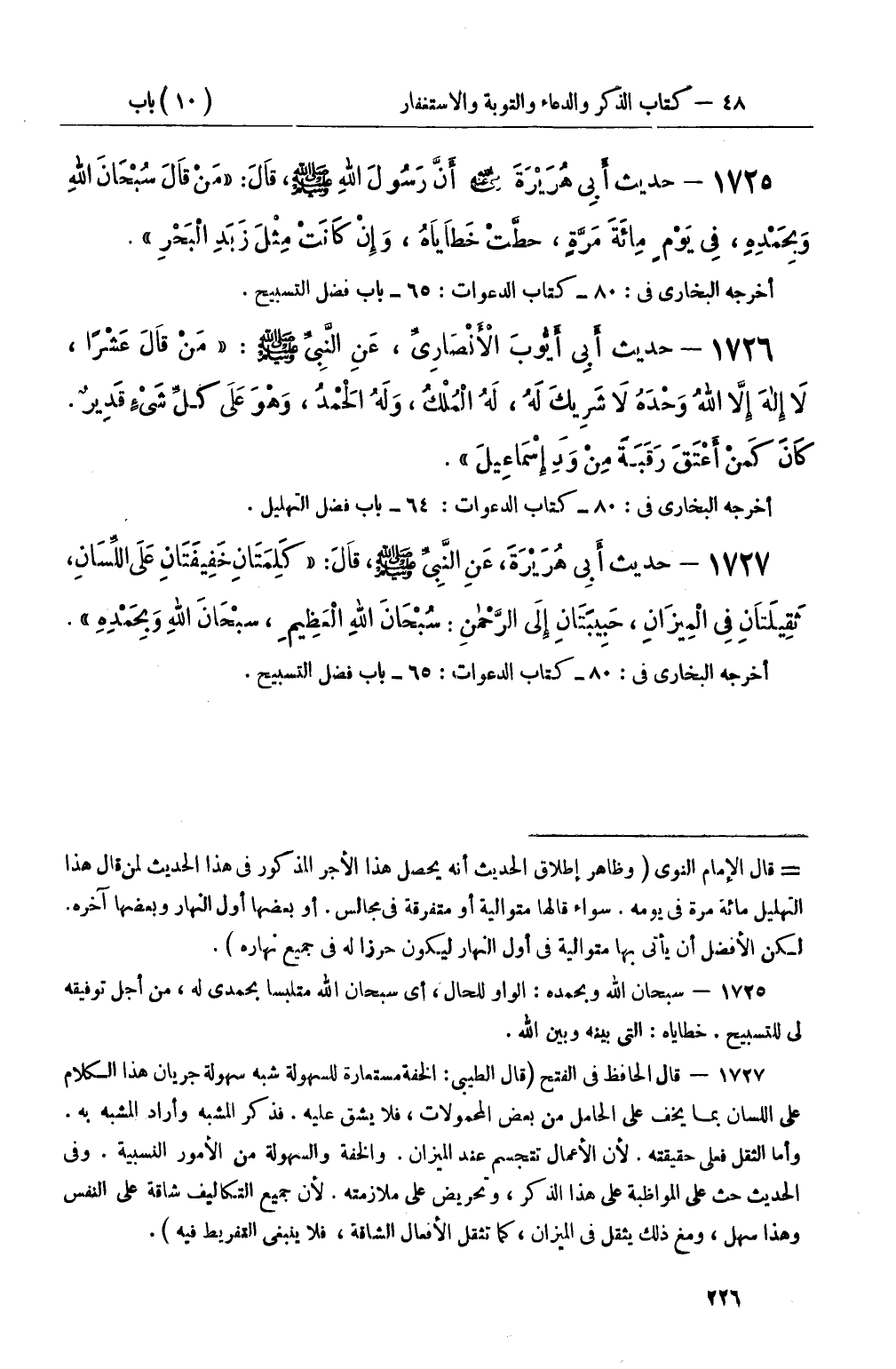 1725 - حديث أَبِي هُرَيْرَةَ رضي الله عنه أَنَّ رَسُولَ اللهِ صَلَّى اللَّهُ عَلَيْهِ وَسَلَّمَ، قَالَ: مَنْ قَالَ سُبْحَانَ اللهِ وَبِحَمْدِهِ، فِي يَوْمٍ مَائَةَ مَرَّةٍ، حَطَّتْ خَطَايَاهُ، وَإِنْ كَانَتْ مِثْلَ زَبَدِ الْبَحْرِ