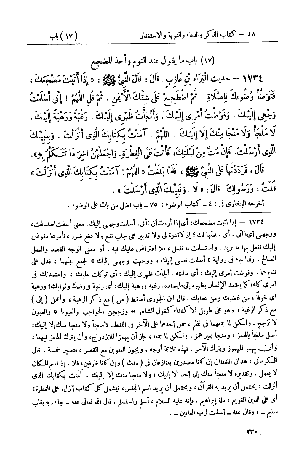 1734 - حديث الْبَرَاءِ بْنِ عَازِبٍ قَالَ: قَالَ النَّبِيُّ صَلَّى اللَّهُ عَلَيْهِ وَسَلَّمَ: إِذَا أَتَيْتَ مَضْجَعَكَ، فَتَوَضَّأ وُضُوءَكَ لِلصَّلاَةِ ثُمَّ اضْطَجِعْ عَلَى شِقِّكَ الأَيْمَنِ ثُمَّ قُلِ: اللهُمَّ إِنِّي أَسْلَمْتُ وَجْهِي إِلَيْكَ وَفَوَّضْتُ أَمْرِي إِلَيْكَ وَأَلْجَأْتُ ظَهْرِي إِلَيْكَ رَغْبَةً وَرَهْبَةً إِلَيْكَ لاَ مَلْجَأَ وَلاَ مَنْجَا مِنْكَ إِلاَّ إِلَيْكَ اللهُمَّ آمَنْتُ بِكِتَابِكَ الَّذِي أَنْزَلْتَ وَبِنَبِيِّكَ الَّذِي أَرْسَلْتَ فَإِنْ مُتَّ مِنْ لَيْلَتِكَ، فَأَنْتَ عَلَى الْفِطْرَةِ وَاجْعَلْهُنَّ آخِرَ مَا تَتَكَلَّمُ بِهِ