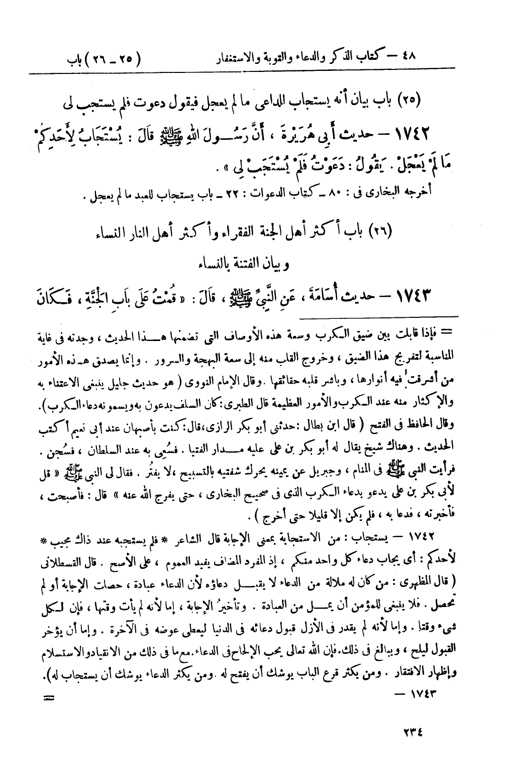 1743 - حديث أُسَامَةَ، عَنِ النَّبِيِّ صَلَّى اللَّهُ عَلَيْهِ وَسَلَّمَ، قَالَ: قُمْتُ عَلَى بَابِ الْجَنَّةِ، فَكَانَ -[235]- عَامَّةَ مَنْ دَخَلَهَا الْمَسَاكِينُ وَأَصْحَابُ الْجَدِّ مَحْبُوسُونَ غَيْرَ أَنَّ أَصْحَابَ النَّارِ، قَدْ أُمِرَ بِهِمْ إِلَى النَّارِ وَقمْتُ عَلَى بَابِ النَّارِ، فَإِذَا عَامَّةُ مَنْ دَخَلَهَا النِّسَاءُ