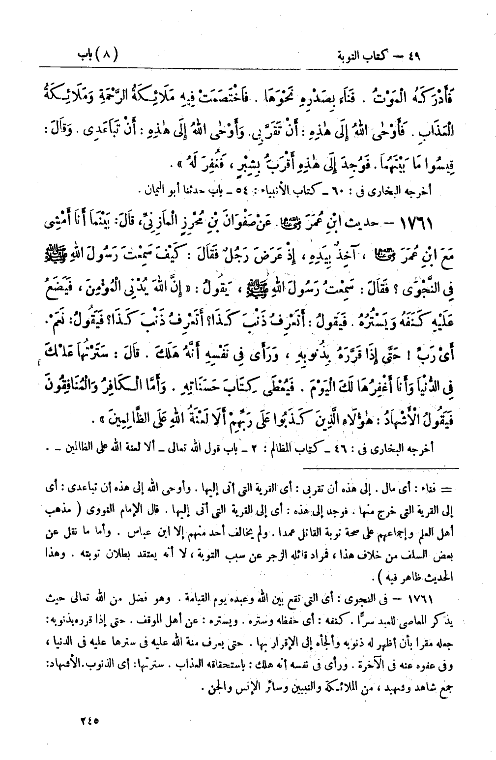 1761 - حديث ابْنِ عُمَرَ عَنْ صَفْوَانَ بْنِ مُحْرِزٍ الْمَازِنِيِّ، قَالَ: بَيْنَمَا أَنَا أَمْشِي مَعَ ابْنِ عُمَرَ، آخِذٌ بِيَدِهِ، إِذْ عَرَضَ رَجُلٌ فَقَالَ: كَيْفَ سَمِعْتَ رَسُولَ اللهِ صَلَّى اللَّهُ عَلَيْهِ وَسَلَّمَ فِي النَّجْوَى فَقَالَ: سَمِعْتُ رَسُولَ اللهِ صَلَّى اللَّهُ عَلَيْهِ وَسَلَّمَ، يَقُولُ: إِنَّ اللهَ يُدْنِي الْمُؤْمِنَ، فَيَضَعُ عَلَيْهِ كَنَفَهُ وَيَسْترُهُ: فَيَقُولُ: أَتَعْرِفُ ذَنْبَ كَذَا أَتَعْرِفُ ذَنْبَ كَذَا فَيَقُولُ: نَعَمْ أَيْ رَبِّ حَتَّى إِذَا قَرَّرَهُ بِذُنوبِهِ، وَرَأَى فِي نَفْسِهِ أَنَّهُ هَلَكَ قَالَ: سَتَرْتُهَا عَليْكَ فِي الدُّنْيَا وَأَنَا أَغْفِرُهَا لَكَ الْيَوْمَ فَيُعْطَى كِتَابَ حَسَنَاتِهِ وَأَمَّا الْكَافِرُ وَالْمُنَافِقُونَ فَيَقُولُ الأَشْهَادُ: هؤُلاَءِ الَّذِينَ كَذَبُوا عَلَى رَبِّهِمْ أَلاَ لَعْنَةُ اللهِ عَلَى الظَّالِمِينَ