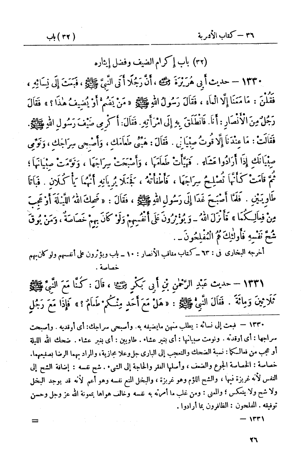 1330 - حديث أَبِي هُرَيْرَةَ رضي الله عنه، أَنَّ رَجُلاً أَتَى النَّبِيَّ صَلَّى اللَّهُ عَلَيْهِ وَسَلَّمَ، فَبَعَثَ إِلَى نِسَائِهِ، فَقُلْنَ: مَا مَعَنَا إِلاَّ الْمَاءُ، فَقَالَ رَسُولُ اللهِ صَلَّى اللَّهُ عَلَيْهِ وَسَلَّمَ مَنْ يَضُمُّ أَوْ يُضِيفُ هذَا فَقَالَ رَجُلٌ مِنَ الأَنْصَارِ: أَنَا فَانْطَلَقَ بِهِ إِلَى امْرَأَتِهِ فَقَالَ: أَكْرِمِي ضَيْفَ رَسُولِ اللهِ صَلَّى اللَّهُ عَلَيْهِ وَسَلَّمَ فَقَالَتْ: مَا عِنْدَنَا إِلاَّ قُوتُ صِبْيَانِي فَقَالَ: هَيِّء طَعَامَكِ، وَأَصْبِحِي سِرَاجَكِ، وَنَوِّمِي صِبْيَانَكِ إِذَا أَرَادُوا عَشَاءً فَهَيَّأَتْ طَعَامَهَا، وَأَصْبَحَتْ سِرَاجَهَا، وَنَوَّمَتْ صِبْيَانَهَا؛ ثُمَّ قَامَتْ كَأَنَّهَا تُصْلِحُ سِرَاجَهَا، فَأَطْفَأَتْهُ، فَجَعَلاَ يُرِيَانِهِ أَنَّهُمَا يَأْكُلاَنِ فَبَاتَا طَاوِيَيْنِ فَلَمَّا أَصْبَحَ غَدَا إِلَى رَسُولِ اللهِ صَلَّى اللَّهُ عَلَيْهِ وَسَلَّمَ، فَقَالَ: ضَحِكَ اللهُ اللَّيْلَةَ أَوْ عَجِبَ مِنْ فِعَالِكُمَا فَأَنْزَلَ اللهُ (وَيُؤْثِرُونَ عَلَى أَنْفُسِهِمْ وَلَوْ كَانَ بِهِمْ خَصَاصَةٌ وَمَنْ يُوقَ شُحَّ نَفْسِهِ فَأَولئِكَ هُمُ الْمُفْلِحُونَ)