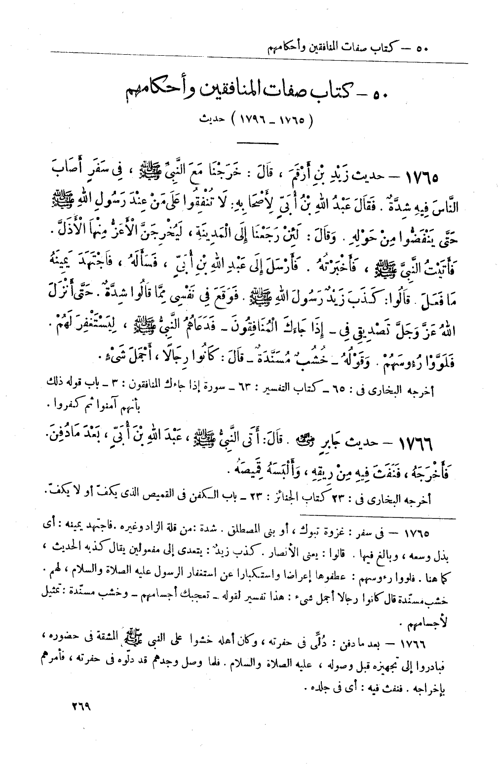 1765 - حديث زَيْدِ بْنِ أَرْقَمَ، قَالَ: خَرَجْنَا مَعَ النَّبِيِّ صَلَّى اللَّهُ عَلَيْهِ وَسَلَّمَ، فِي سَفَرٍ أَصَابَ النَّاسَ فِيهِ شِدَّةٌ فَقَالَ عَبْدُ اللهِ بْنُ أُبَيٍّ لأَصْحَابِهِ: لاَ تُنْفِقُوا عَلَى مَنْ عِنْدَ رَسُولِ اللهِ صَلَّى اللَّهُ عَلَيْهِ وَسَلَّمَ حَتَّى يَنْفَضُّوا مِنْ حَوْلِهِ وَقَالَ: لَئِنْ رَجَعْنَا إِلَى الْمَدِينَةِ، لَيُخْرِجَنَّ الأَعَزُّ مِنْهَا الأَذَلَّ فَأَتَيْتُ النَّبِيَّ صَلَّى اللَّهُ عَلَيْهِ وَسَلَّمَ، فَأَخْبَرْتُهُ فَأَرْسَلَ إِلَى عَبْدِ اللهِ بْنِ أُبَيٍّ، فَسَأَلَهُ، فَاجْتَهَدَ يَمِينَهُ مَا فَعَلَ قَالُوا: كَذَبَ زَيْدٌ رَسُولَ اللهِ صَلَّى اللَّهُ عَلَيْهِ وَسَلَّمَ فَوَقَعَ فِي نَفْسِي مِمَّا قَالُوا شِدَّةٌ حَتَّى أَنْزَلَ اللهُ عَزَّ وَجَلَّ تَصْدِيقِي فِي (إِذَا جَاءَكَ الْمُنَافِقُونَ) فَدَعَاهُمُ النَّبِيُّ صَلَّى اللَّهُ عَلَيْهِ وَسَلَّمَ، لِيَسْتَغْفِرَ لَهُمْ فَلَوَّوْا رُءُوسَهُمْ وَقَوْلُهُ (خُشُبٌ مُسَنَّدَةٌ) قَالَ: كَانُوا رِجَالاً، أَجْمَلَ شَيْءٍ