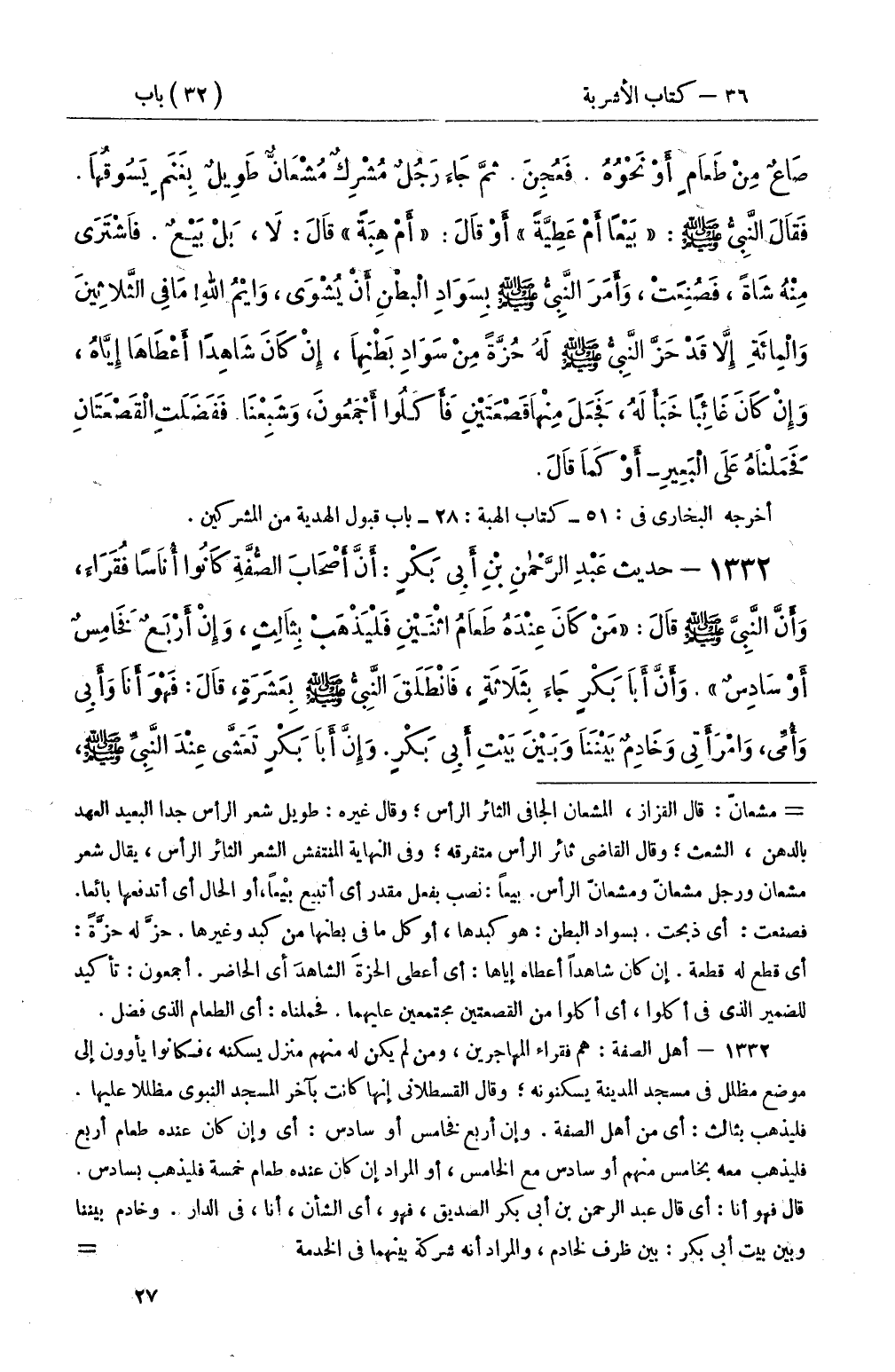 1332 - حديث عَبْدِ الرَّحْمنِ بْنِ أَبِي بَكْرٍ: أَنَّ أَصْحَابَ الصُّفَّةِ كَانُوا أُنَاسًا فُقَرَاءَ، وَأَنَّ النَّبِيَّ صَلَّى اللَّهُ عَلَيْهِ وَسَلَّمَ قَالَ: مَنْ كَانَ عِنْدَهُ طَعَامُ اثْنَيْنِ فَلْيَذْهَبْ بِثَالِثٍ، وَإِنْ أَرْبَعٌ فَخَامِسٌ أَوْ سَادِسٌ وَأَنَّ أَبَا بَكْرٍ جَاءَ بِثَلاَثَةٍ، فَانْطَلَقَ النَّبِيُّ صَلَّى اللَّهُ عَلَيْهِ وَسَلَّمَ بِعَشَرَةٍ، قَالَ: فَهُوَ أَنَا وَأَبِي وَأُمِّي، وَامْرَأَتِي وَخَادِمٌ بَيْنَنَا وَبَيْنَ بَيْتِ أَبِي بَكْرٍ وَإِنَّ أَبَا بَكْرٍ تَعَشَّى عِنْدَ النَّبِيِّ صَلَّى اللَّهُ عَلَيْهِ وَسَلَّمَ، -[28]- ثُمَّ لَبِثَ حَيْثُ صُلِّيَتِ الْعِشَاءُ، ثُمَّ رَجَعَ فَلَبِثَ حَتَّى تَعَشَّى النَّبِيُّ صَلَّى اللَّهُ عَلَيْهِ وَسَلَّمَ، فَجَاءَ بَعْدَ مَا مَضى مِنَ اللَّيْلِ مَا شَاءَ اللهُ قَالَتْ لَهُ امْرَأَتُهُ: وَمَا حَبَسَكَ عَنْ أَضْيَافِكَ، أَوْ قَالَتْ: ضَيْفِكَ قَالَ: أَوَ مَا عَشَّيْتِيهِمْ قَالَتْ: أَبَوْا حَتَّى تَجِي، قَدْ عُرِضُوا فَأَبَوْا قَال: فَذَهَبْتُ أَنَا فَاخْتَبَأْتُ فَقَالَ: يَا غُنْثَرُ فَجَدَّعَ وَسَبَّ وَقَالَ: كُلُوا، لاَ هَنِيئًا فَقَالَ: وَاللهِ لاَ أَطْعُمُه أَبَدًا وَايْمُ اللهِ مَا كُنّا نَأْخُذُ مِنْ لُقْمَةٍ إِلاَّ رَبَا مِنْ أَسْفَلِهَا أَكْثَرُ مِنْهَا، قَالَ: يَعْنِي حَتَّى شَبِعُوا، وَصَارَتْ أَكْثَرَ مِمَّا كَانَتْ قَبْلَ ذَلِكَ فَنَظَرَ إِلَيْهَا أَبُو بَكْرٍ فَإِذَا هِيَ كَمَا هِيَ أَوْ أَكْثَرُ مِنْهَا فَقَالَ لاِمْرَأَتِهِ: يَا أُخْتَ بَنِي فِرَاسٍ مَا هذَا قَالَتْ: لاَ، وَقُرَّةِ عَيْنِي لَهِيَ الآنَ أَكْثَرُ مِنْهَا قَبْلَ ذَلِكَ بِثَلاَثِ مَرَّاتٍ فَأَكَلَ مِنْهَا أَبُو بَكْرٍ، وَقَالَ: إِنَّمَا كَانَ ذَلِكَ مِنَ الشَّيْطَانِ، يَعْنِي يَمِينَهُ ثُمَّ أَكَلَ مِنْهَا لُقْمَةً ثُمَّ حَمَلَهَا إِلَى النَّبِيِّ صَلَّى اللَّهُ عَلَيْهِ وَسَلَّمَ فَأَصْبَحَتْ عِنْدَهُ