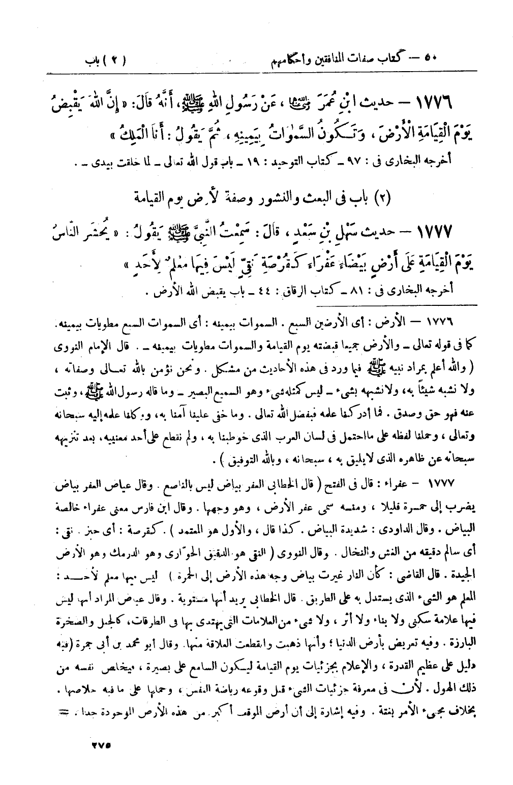 1776 - حديث ابْنِ عُمَرَ رضي الله عنهما، عَنْ رَسُولِ اللهِ صَلَّى اللَّهُ عَلَيْهِ وَسَلَّمَ، أَنَّهُ قَالَ: إِنَّ اللهَ يَقْبِضُ يَوْمَ الْقِيَامَةِ الأَرْضَ، وَتَكُونُ السَّموَاتُ بِيَمِينِهِ، ثُمَّ يَقُولُ: أَنَا الْمَلِكُ