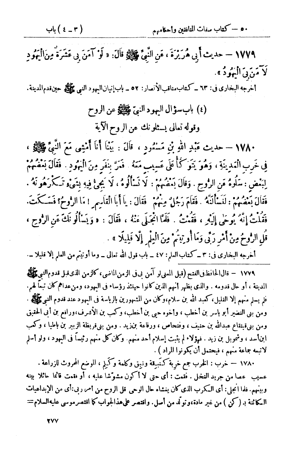 1780 - حديث عَبْدِ اللهِ بْنِ مَسْعُودٍ، قَالَ: بَيْنَا أَنَا أَمْشِي مَعَ النَّبِيِّ صَلَّى اللَّهُ عَلَيْهِ وَسَلَّمَ، فِي خَرِبِ الْمَدِينَةِ، وَهُوَ يَتَوكَّأُ عَلَى عَسِيبٍ مَعَهُ فَمَرَّ بِنَفَرٍ مِنَ الْيَهُودِ فَقَالَ بَعْضُهُمْ لِبَعْضٍ: سَلُوهُ عَنِ الرُّوحِ وَقَالَ بَعْضُهُمْ: لاَ تَسْأَلُوهُ، لاَ يَجِيءُ فِيهِ بِشَيْءٍ تَكْرَهُونَهُ فَقَالَ بَعْضُهُمْ: لَنَسْأَلَنَّهُ فَقَامَ رَجُلٌ مِنْهُمْ فَقَالَ: يَا أَبَا الْقَاسِمِ مَا الرُّوحُ فَسكَتَ فَقُلْتُ إِنَّهُ يُوحى إِلَيْهِ، فَقُمْتُ فَلَمَّا انْجَلَى عَنْهُ، فَقَالَ: وَيَسْأَلُونَكَ عَنِ الرُّوحِ قُلِ الرُّوحُ مِنْ أَمْرِ رَبِّي وَمَا أُوتِيتُمْ مِنَ الْعِلْمِ إِلاَّ قَلِيلاً
