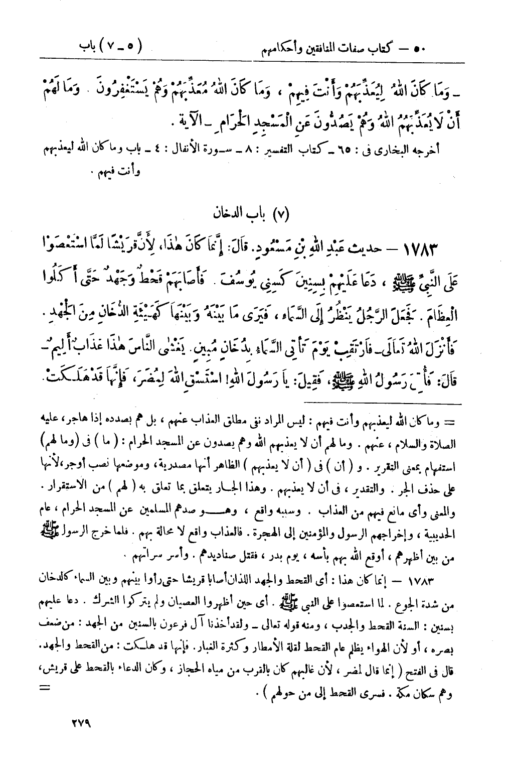 1783 - حديث عَبْدِ اللهِ بْنِ مَسْعُودٍ قَالَ: إِنَّمَا كَانَ هذَا، لأَنَّ قرَيْشًا لَمَّا اسْتَعْصَوْا عَلَى النَّبِيِّ صَلَّى اللَّهُ عَلَيْهِ وَسَلَّمَ، دَعَا عَلَيْهِمْ بِسِنينَ كَسِنِي يُوسُفَ فَأَصَابَهَمْ قَحْطٌ وَجَهْدٌ حَتَّى أَكَلُوا الْعِظَامَ فَجَعَلَ الرَّجُلُ يَنْظُرُ إِلَى السَّمَاءِ، فَيَرَى مَا بَيْنَهُ وَبَيْنَهَا كَهَيْئَةِ الدُّخَانِ مِنَ الْجَهْدِ فَأَنْزَلَ اللهُ تَعَالَى (فَارْتَقِبْ يَوْمَ تَأْتِي السَّمَاءُ بِدُخَانٍ مُبِينٍ يَغْشى النَّاسَ هذَا عَذَابٌ أَلِيمٌ) قَالَ: فَأُتِي رَسُولُ اللهِ صَلَّى اللَّهُ عَلَيْهِ وَسَلَّمَ، فَقِيلَ: يَا رَسُولَ اللهِ اسْتَسْقِ اللهَ لِمُضَرَ، فَإِنَّهَا قَدْ هَلَكَتْ -[280]- قَالَ: لِمُضَرَ إِنَّكَ لَجَرِيءٌ فَاسْتَسْقَى، فَسُقُوا، فَنَزَلَتْ (إِنَّكُمْ عَائِدُونَ) فَلَمَّا أَصَابَتْهُمُ الرَّفَاهِيَةُ، عَادُوا إِلَى حَالِهِمْ، حِينَ أَصَابَتْهُمُ الرَّفَاهِيَةُ فَأَنْزَلَ اللهُ عَزَّ وَجَلَّ (يَوْمَ نَبْطِشُ الْبَطْشَة الْكُبْرَى إِنَّا مُنْتَقِمُونَ) قَالَ: يَعْنِي يَوْمَ بَدْرٍ