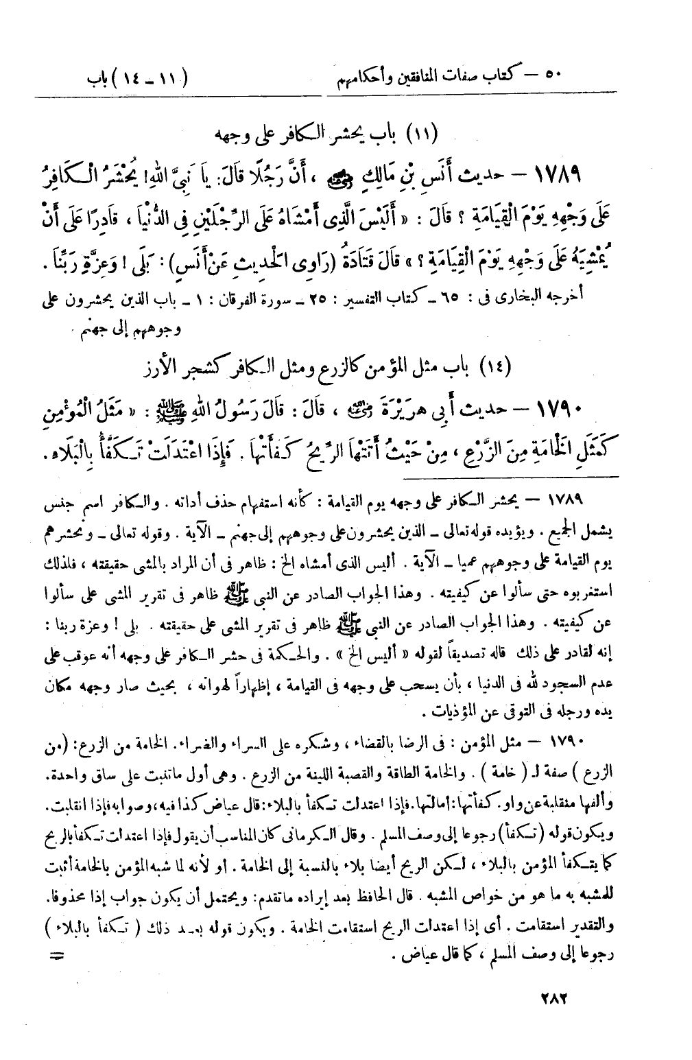 1789 - حديث أَنَسِ بْنِ مَالِكٍ رضي الله عنه، أَنَّ رَجُلاً قَالَ: يَا نَبِيَّ اللهِ يُحْشَرُ الْكَافِرُ عَلَى وَجْهِهِ يَوْمَ الْقِيَامَةِ قَالَ: أَلَيْسَ الَّذِي أَمْشَاهُ عَلَى الرِّجْلَيْنِ فِي الدُّنْيَا، قَادِرًا عَلَى أَنْ يُمْشِيَهُ عَلَى وَجْهِهِ يَوْمَ الْقِيَامَةِ قَالَ قَتَادَةُ (رَاوِي الْحَدِيثِ عَنْ أَنَسٍ) : بَلَى وَعِزَّةِ رَبِّنَا