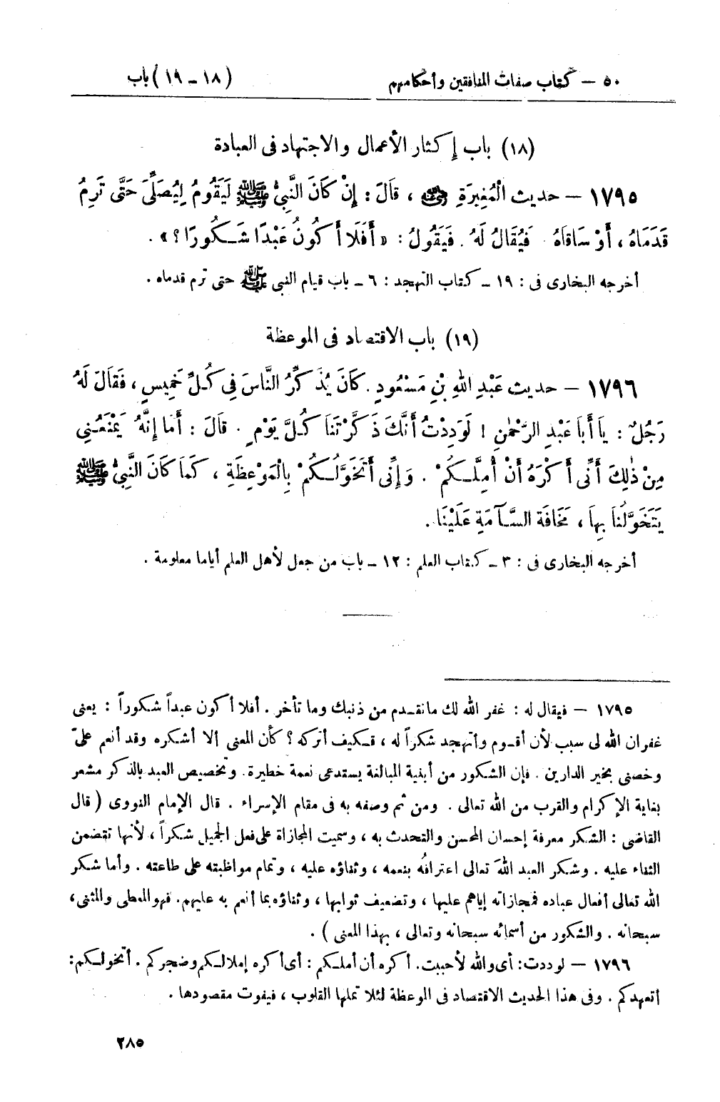1795 - حديث الْمُغِيرَةِ رضي الله عنه، قَالَ: إِنْ كَانَ النَّبِيُّ صَلَّى اللَّهُ عَلَيْهِ وَسَلَّمَ لَيَقُومُ لِيُصَلِّيَ حَتَّى تَرِمُ قَدَمَاهُ، أَوْ سَاقَاهُ فَيُقَالُ لَهُ فَيَقُولُ: أَفَلاَ أَكُونُ عَبْدًا شَكُورًا