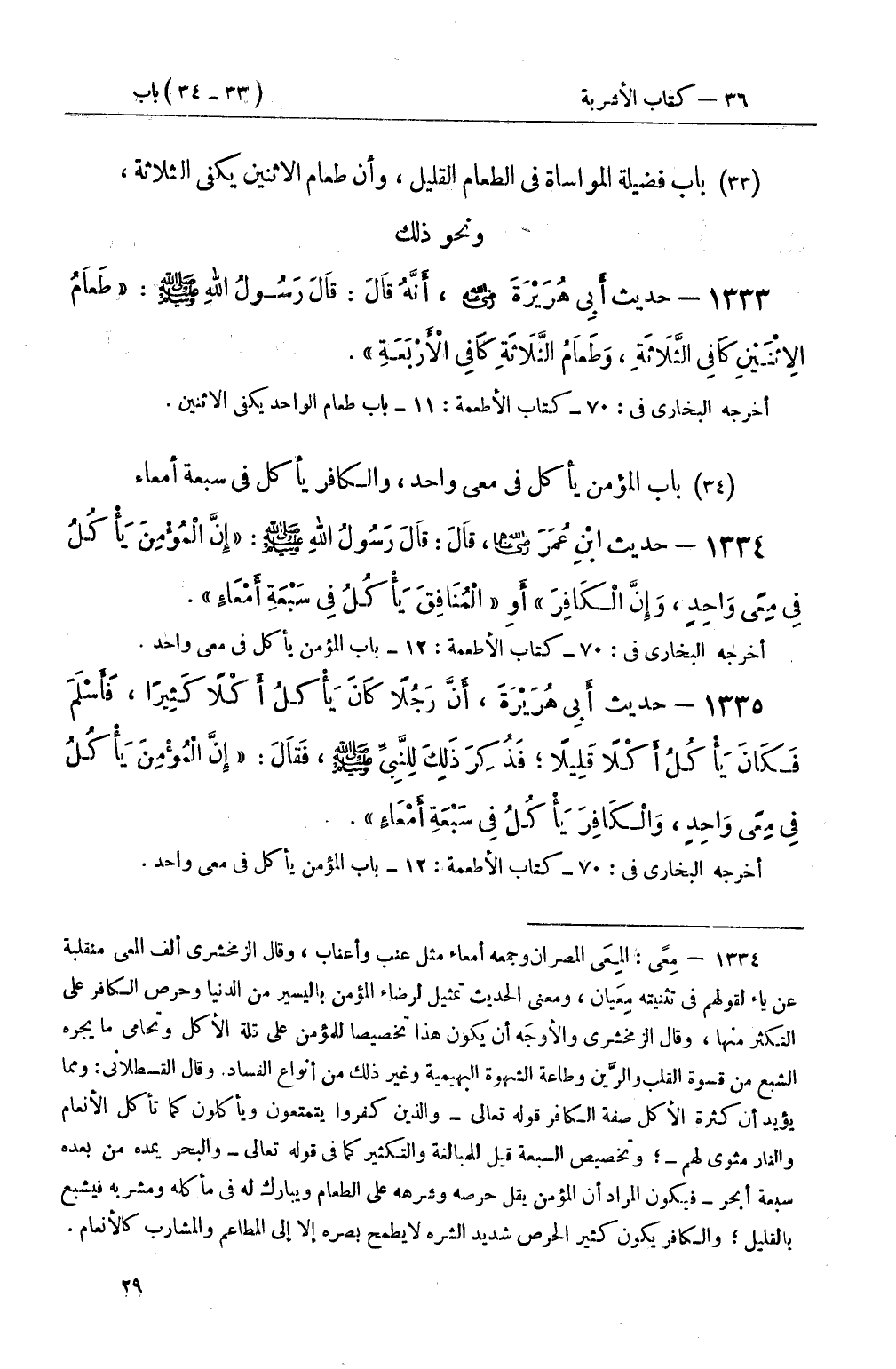 1335 - حديث أَبِي هُرَيْرَةَ، أَنَّ رَجُلاً كَانَ يَأْكلُ كَثِيرًا، فَأَسْلَمَ فَكَانَ يَأْكُلُ أَكْلاً قَلِيلاً؛ فَذُكِرَ ذَلِكَ لِلنَّبِيِّ صَلَّى اللَّهُ عَلَيْهِ وَسَلَّمَ، فَقَالَ: إِنَّ الْمُؤْمِنَ يَأْكُلُ فِي مِعًى وَاحِدٍ، وَالْكَافِرَ يَأْكُلُ فِي سَبْعَةِ أَمْعَاءٍ