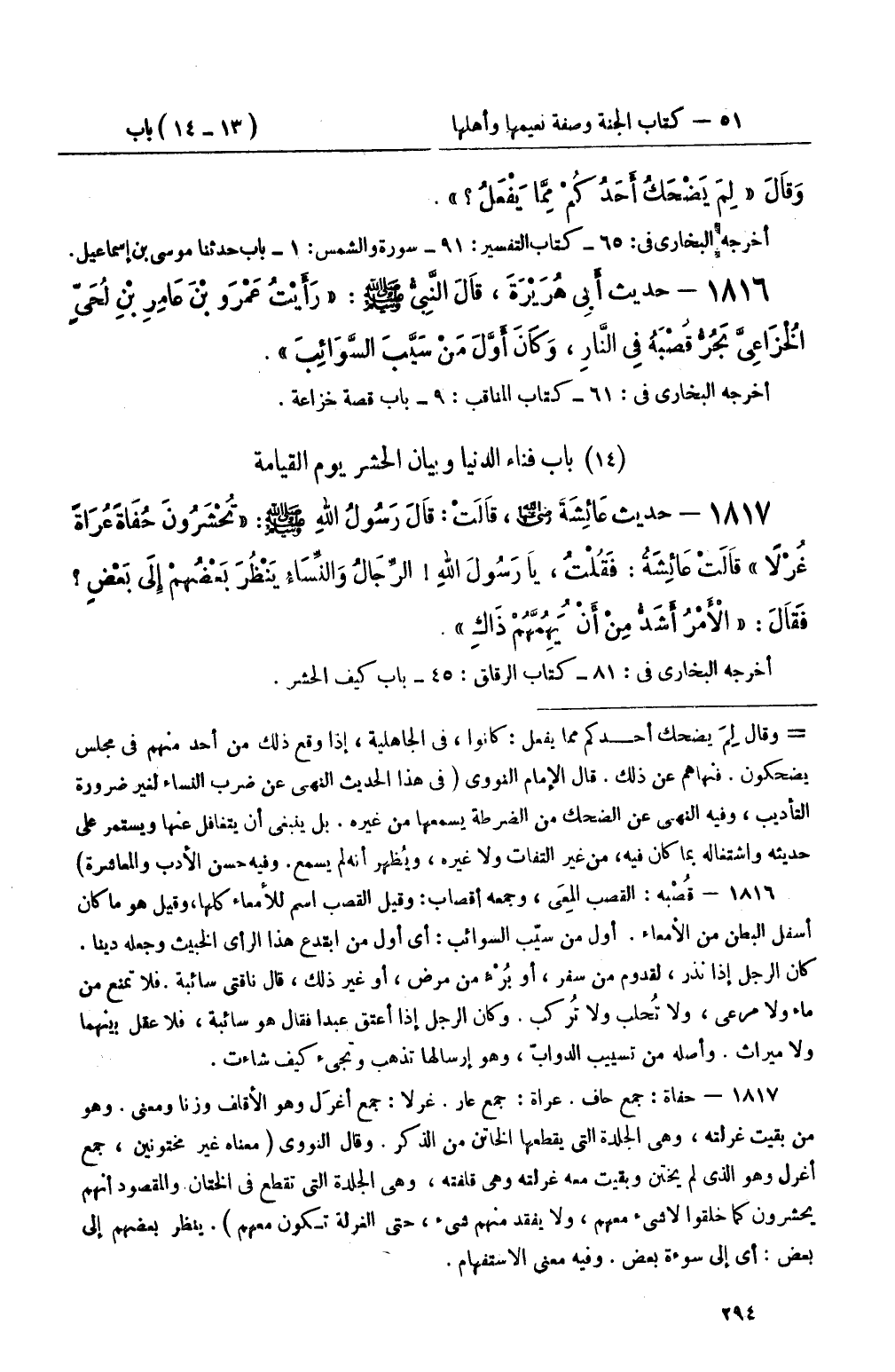 1817 - حديث عَائِشَةَ، قَالَتْ: قَالَ رَسُولُ اللهِ صَلَّى اللَّهُ عَلَيْهِ وَسَلَّمَ: تُحْشَرُونَ حُفَاةً عُرَاةً غُرْلاً قَالَتْ عَائِشَةُ: فَقُلْتُ، يَا رَسُولَ اللهِ الرِّجَالُ وَالنِّسَاءُ يَنْظُرَ بَعْضُهُمْ إِلَى بَعْضٍ فَقَالَ: الأَمْرُ أَشَدُّ مِنْ أَنْ يَهِمَّهُمْ ذَاكِ