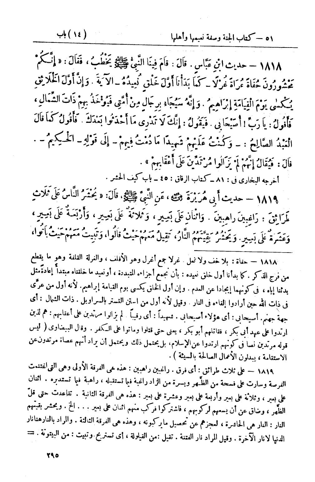 1818 - حديث ابْنِ عَبَّاسٍ قَالَ: قَامَ فِينَا النَّبِيُّ صَلَّى اللَّهُ عَلَيْهِ وَسَلَّمَ يَخْطُبُ، فَقَالَ: إِنَّكُمْ مَحْشُورُونَ حُفَاةً عُرَاةً غُرْلاً (كَمَا بَدَأْنَا أَوَّلَ خَلْقٍ نُعِيدُهُ) الآيَةَ وَإِنَّ أَوَّلَ الْخَلاَئِقِ يُكْسى يَوْمَ الْقَيَامَةِ إِبْرَاهِيمُ وَإِنَّهُ سَيُجَاءُ بِرِجَالٍ مَنْ أُمَّتِي فَيُؤْخَذُ بِهِمْ ذَاتَ الشِّمَالِ، فَأَقُولُ: يَا رَبِّ أُصَيْحَابِي فَيَقُولُ: إِنَّكَ لاَ تَدْرِي مَا أَحْدَثُوا بَعْدَكَ فَأَقُولُ كَمَا قَالَ الْعَبْدُ الصَّالِحُ: (وَكُنْتُ عَلَيْهِمْ شَهِيدًا مَا دُمْتُ فِيهِمْ) إِلَى قَوْلِهِ (الْحَكِيمُ) قَالَ: فَيُقَالُ إِنَّهُمْ لَمْ يَزَالُوا مُرْتَدِّينَ عَلَى أَعْقَابِهِمْ