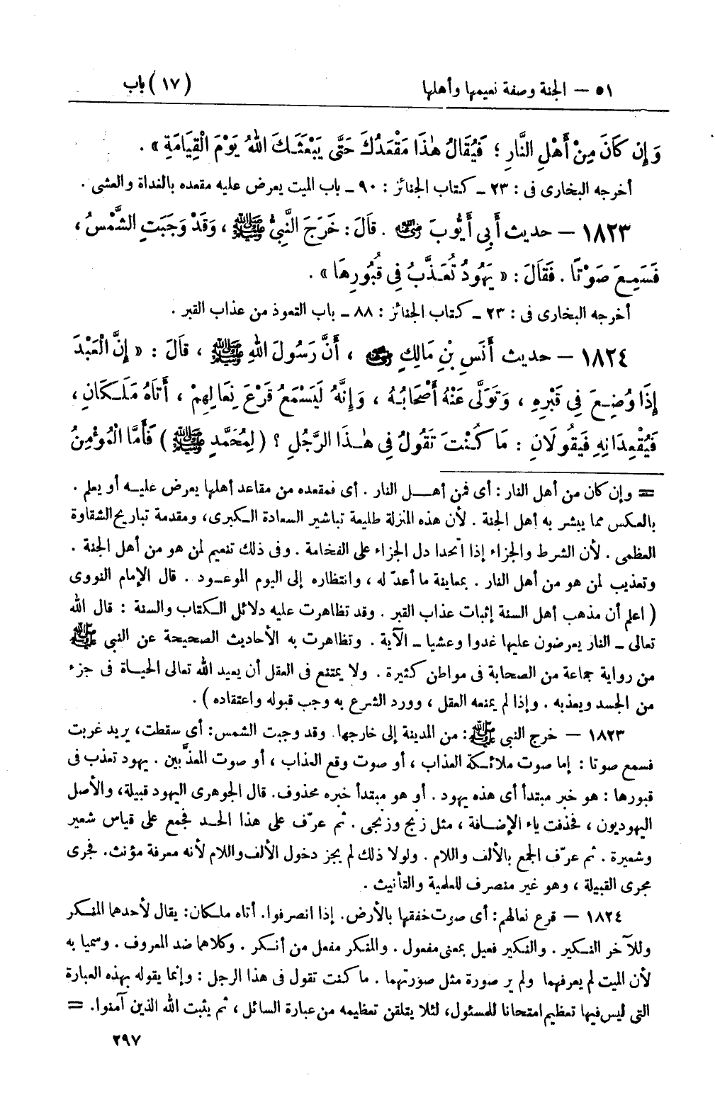 1824 - حديث أَنَسِ بْنِ مَالِكٍ رضي الله عنه، أَنَّ رَسُولَ اللهِ صَلَّى اللَّهُ عَلَيْهِ وَسَلَّمَ، قَالَ: إِنَّ الْعَبْدَ إِذَا وُضِعَ فِي قَبْرِهِ، وَتَوَلَّى عَنْهُ أَصْحَابُهُ، وَإِنَّهُ لَيَسْمَعُ قَرْعَ نِعَالِهِمْ، أَتَاهُ مَلَكَانِ، فَيُقعِدَانِهِ فَيقُولاَنِ: مَا كُنْتَ تَقُولُ فِي هذَا الرَّجُلِ (لِمُحَمَّدٍ صَلَّى اللَّهُ عَلَيْهِ وَسَلَّمَ) فَأَمَّا الْمُؤْمِنُ -[298]- فَيَقُولُ: أَشْهَدُ أَنَّهُ عَبْدُ اللهِ وَرَسُولُهُ فَيُقَالُ لَهُ: انْظُرْ إِلَى مَقْعَدِكَ مِنَ النَّارِ، قَدْ أَبْدَلَكَ اللهُ بِهِ مَقْعَدًا مِنَ الْجَنَّةِ فَيَرَاهُمَا جَمِيعًا