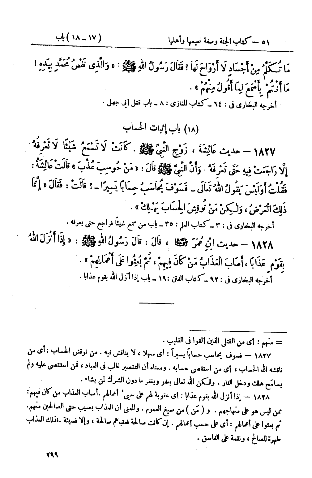 1827 - حديث عَائِشَةَ، زَوْجِ النَّبِيِّ صَلَّى اللَّهُ عَلَيْهِ وَسَلَّمَ كَانَتْ لاَ تَسْمَعُ شَيْئًا لاَ تَعْرِفُهُ إِلاَّ رَاجَعَتْ فِيهِ حَتَّى تَعْرِفَهُ وَأَنَّ النَّبِيَّ صَلَّى اللَّهُ عَلَيْهِ وَسَلَّمَ قَالَ: مَنْ حُوسِبَ عُذِّبَ قَالَتْ عَائِشَةُ: فَقُلْتُ أَوَلَيْسَ يَقُولُ اللهُ تَعَالَى (فَسَوْفَ يُحَاسَبُ حِسَابًا يَسِيرًا) قَالَتْ: فَقَالَ إِنَّمَا ذَلِكَ الْعَرْضُ، وَلكِنْ مَنْ نُوقِشَ الْحِسَابَ يَهْلِكْ