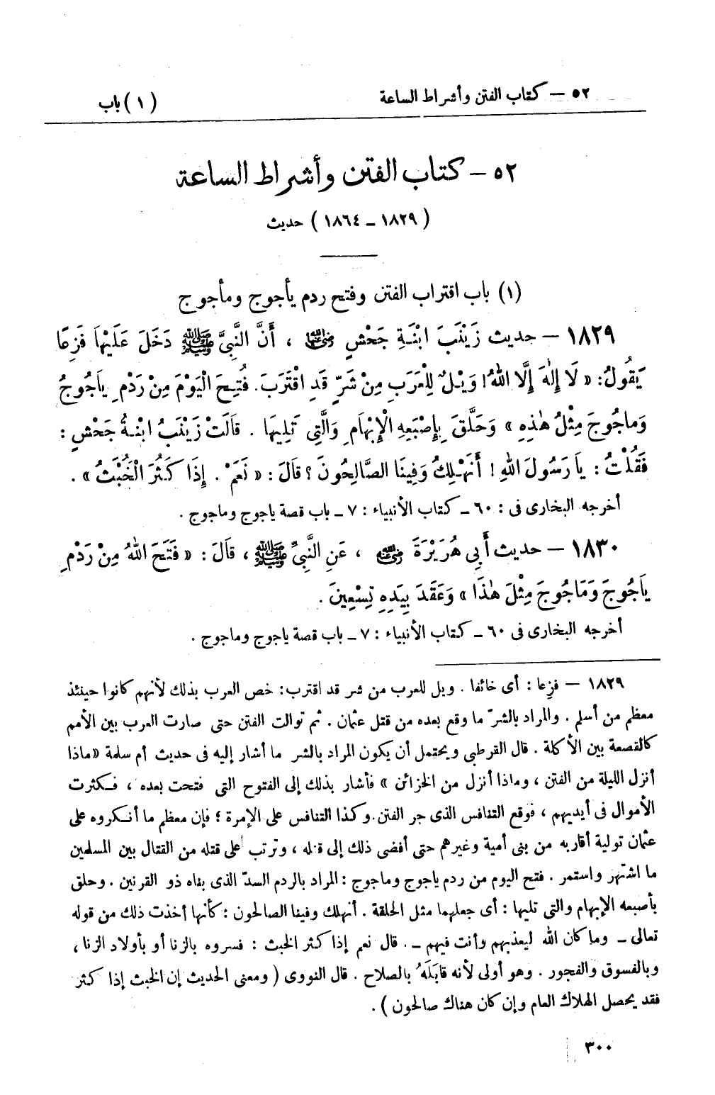 1829 - حديث زَيْنَبَ ابْنَةِ جَحْشٍ، أَنَّ النَّبِيَّ صَلَّى اللَّهُ عَلَيْهِ وَسَلَّمَ دَخَلَ عَلَيْهَا فَزِعًا يَقُولُ: لاَ إِلهَ إِلاَّ اللهُ وَيْلٌ لِلْعَرَبِ مِنْ شَرٍّ قَدِ اقْتَرَبَ فُتِحَ الْيَوْمَ مِنْ رَدْمِ يَأجُوجَ وَمأجُوجَ مِثْلُ هذِهِ وَحَلَّقَ بِإِصْبَعِهِ الإِبْهَامِ وَالَّتِي تَلِيهَا قَالَتْ زَيْنَبُ ابْنةُ جَحْشٍ: فَقُلْتُ: يَا رَسُولَ اللهِ أَنَهْلِكُ وَفِينَا الصَّالِحُونَ قَالَ: نَعَمْ إِذَا كَثُرَ الْخَبَثُ
