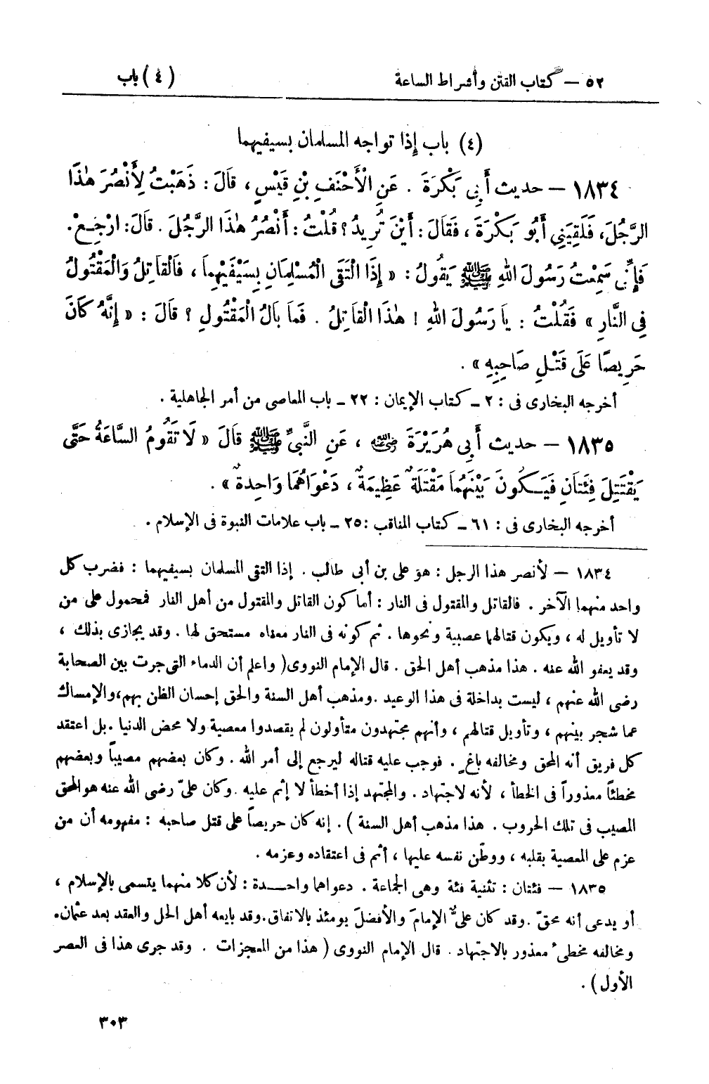 1834 - حديث أَبِي بَكْرَةَ عَنِ الأَحْنَفِ بْنِ قَيْسٍ، قَالَ: ذَهَبْتُ لأَنْصُرَ هذَا الرَّجُلَ، فَلَقِيَنِي أَبُو بَكْرَةَ، فَقَالَ: أَيْنَ تُرِيدُ قُلْتُ: أَنْصُرُ هذَا الرَّجُلَ قَالَ: ارْجِعْ فَإِنِّي سَمِعْتُ رَسُولَ اللهِ صَلَّى اللَّهُ عَلَيْهِ وَسَلَّمَ يَقُولُ: إِذَا الْتَقَى الْمُسْلِمَانِ بِسَيْفَيْهِمَا، فَالْقَاتِلُ وَالْمَقْتُولُ فِي النَّارِ فَقُلْتُ: يَا رَسُولَ اللهِ هذَا الْقَاتِلُ فَمَا بَالُ الْمَقْتُولِ قَالَ: إِنَّهُ كَانَ حَرِيصًا عَلَى قَتْلِ صَاحِبِهِ