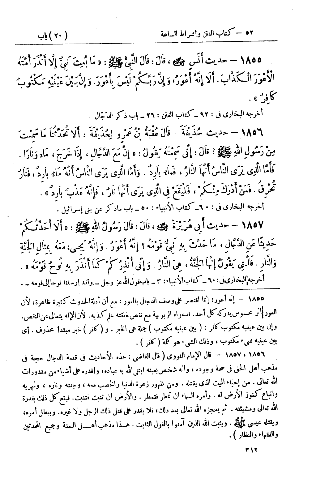 1855 - حديث أَنَسٍ رضي الله عنه، قَالَ: قَالَ النَّبِيُّ صَلَّى اللَّهُ عَلَيْهِ وَسَلَّمَ: مَا بُعِثَ نَبِيٌّ إِلاَّ أَنْذَرَ أُمَّتَهُ الأَعْوَرَ الْكَذَّابَ أَلاَ إِنَّهُ أَعْوَرُ، وَإِنَّ رَبَّكُمْ لَيْسَ بِأَعْوَرَ وَإِنَّ بَيْنَ عَيْنَيْهِ مَكْتُوبٌ كَافِرٌ