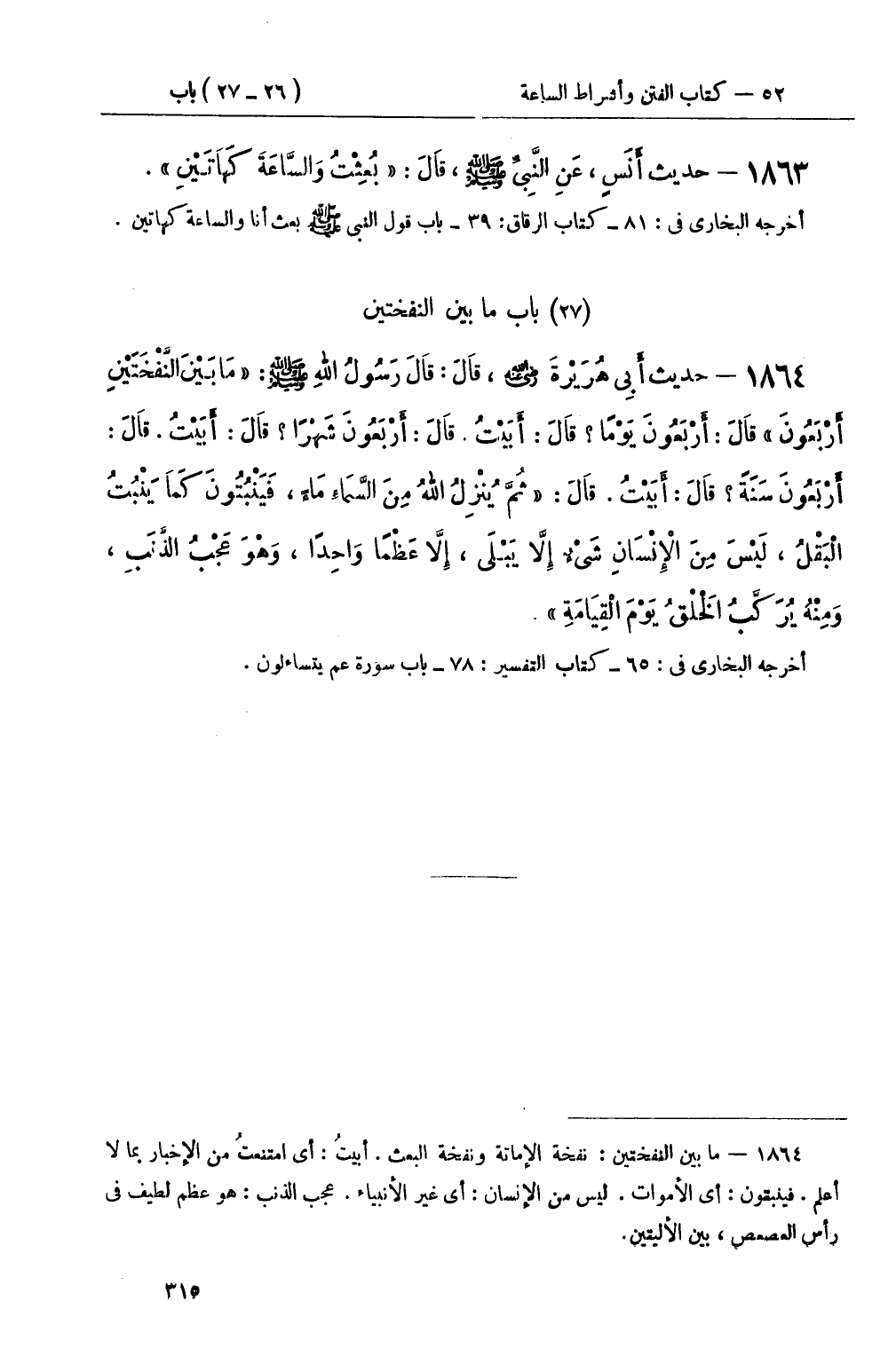 1864 - حديث أَبِي هُرَيْرَةَ رضي الله عنه، قَالَ: قَالَ رَسُولُ اللهِ صَلَّى اللَّهُ عَلَيْهِ وَسَلَّمَ: مَا بَيْنَ النَّفْخَتَيْنِ أَرْبَعُونَ قَالَ: أَرْبَعُونَ يَوْمًا قَالَ: أَبَيْتُ قَالَ: أَرْبَعُونَ شَهْرًا قَالَ: أَبَيْتُ قَالَ: أَرْبَعُونَ سَنَةً قَالَ: أَبَيْتُ قَالَ: ثُمَّ يُنْزِلُ اللهُ مِنَ السَّمَاءِ مَاءً، فَيَنْبُتُونَ كَمَا يَنْبُتُ البَقْلُ، لَيْسَ مِنَ الإِنْسَانِ شَيْءٌ إِلاَّ يَبْلَى، إِلاَّ عَظْمًا وَاحِدًا، وَهُوَ عَجْبُ الذَّنَبِ، وَمِنْهُ يُرَكَّبُ الْخَلْقُ يَوْمَ الْقِيَامَةِ