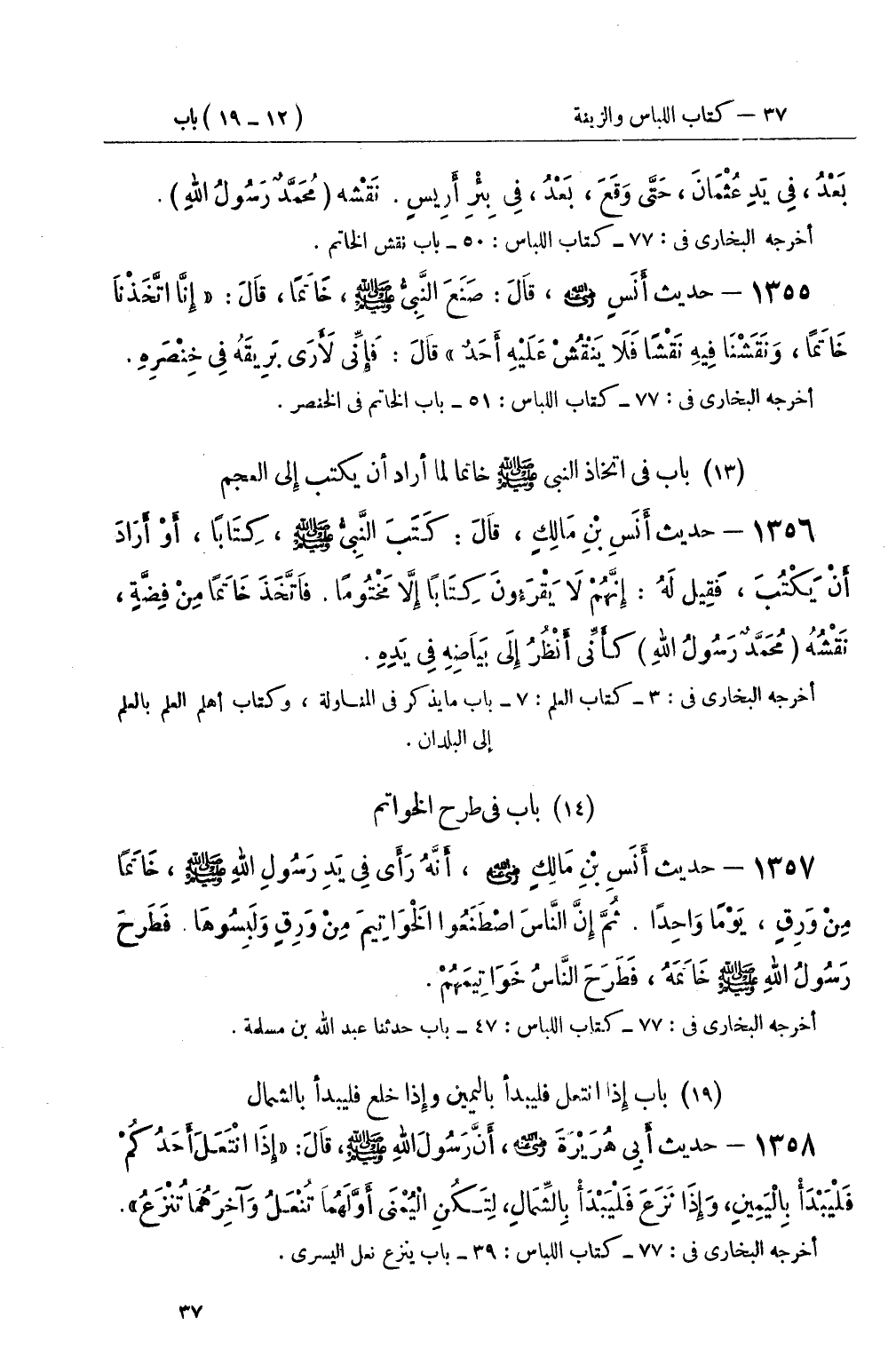 1355 - حديث أَنَسٍ رضي الله عنه، قَالَ: صَنَعَ النَّبِيُّ صَلَّى اللَّهُ عَلَيْهِ وَسَلَّمَ، خَاتَمًا، قَالَ: إِنَّا اتَّخَذْنَا خَاتَمًا، وَنَقَشْنَا فِيهِ نَقْشًا فَلاَ يَنْقُشْ عَلَيْهِ أَحَدٌ قَالَ: فَإِنِّي لأَرَى بَرِيقَهُ فِي خِنْصَرِهِ