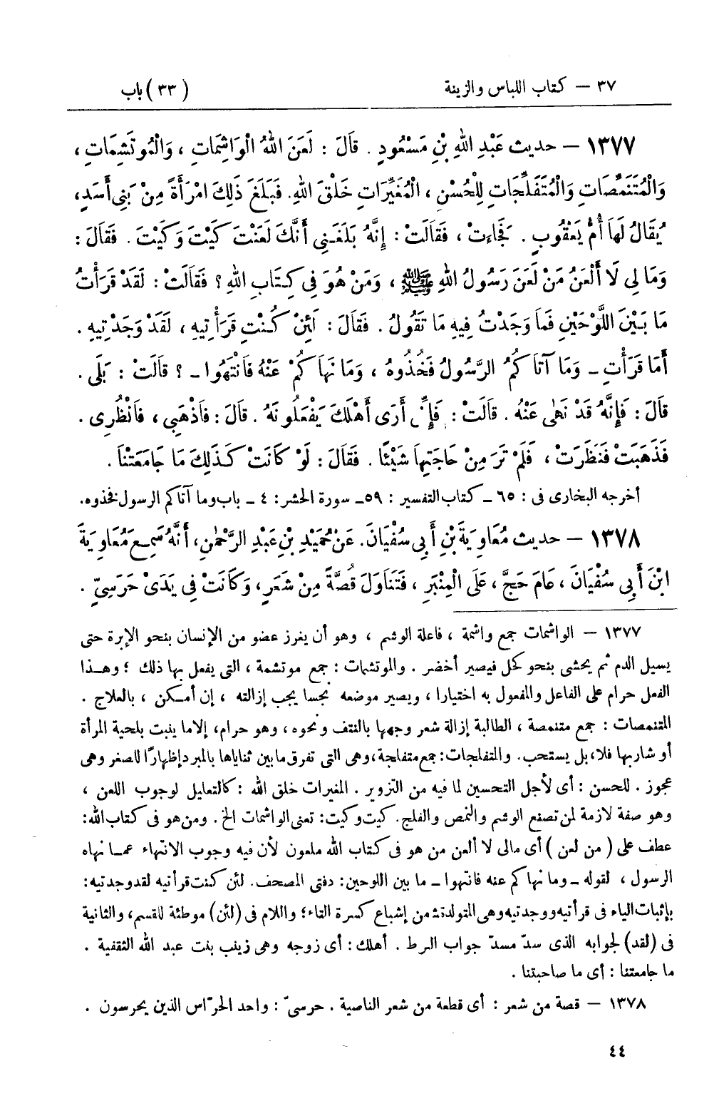 1377 - حديث عَبْدِ اللهِ بْنِ مَسْعُودٍ قَالَ: لَعَنَ اللهُ الْوَاشِمَاتِ، وَالْمُوتَشِمَاتِ، وَالْمُتَنَمِّصَاتِ وَالْمُتَفَلِّجَاتِ لِلْحُسْنِ، الْمُغَيِّرَاتِ خَلْقَ اللهِ فَبَلَغَ ذَلِكَ امْرَأَةً مِنْ بَنِي أَسَدٍ، يُقَالُ لَهَا أُمُّ يَعْقُوبٍ فَجَاءَتْ، فَقَالَتْ: إِنَّهُ بَلَغَنِي أَنَّكَ لَعَنْتَ كَيْتَ وَكَيْتَ فَقَالَ: وَمَا لِي لاَ أَلْعَنُ مَنْ لَعَنَ رَسُولُ اللهِ صَلَّى اللَّهُ عَلَيْهِ وَسَلَّمَ، وَمَنْ هُوَ فِي كِتَابِ اللهِ فَقَالَتْ: لَقَدْ قَرَأْتُ مَا بَيْنَ اللَّوْحَيْنِ فَمَا وَجَدْتُ فِيهِ مَا تَقُولُ فَقَالَ: لَئِنْ كُنْتِ قَرَأْتِيهِ، لَقَدْ وَجَدْتِيهِ أَمَا قَرَأْتِ (وَمَا آتَاكُمُ الرَّسُولُ فَخُذُوهُ، وَمَا نَهَاكُمْ عَنْهُ فَانْتَهُوا) قَالَتْ: بَلَى قَالَ: فَإِنَّهُ قَدْ نَهى عَنْهُ قَالَتْ: فَإِنِّي أَرَى أَهْلَكَ يَفْعَلُونَهُ قَالَ: فَاذْهَبِي، فَانْظُرِي فَذَهَبَتْ فَنَظَرَتْ، فَلَمْ تَرَ مِنْ حَاجَتِهَا شَيْئًا فَقَالَ: لَوْ كَانَتْ كَذَلِكَ مَا جَامَعَتْنَا