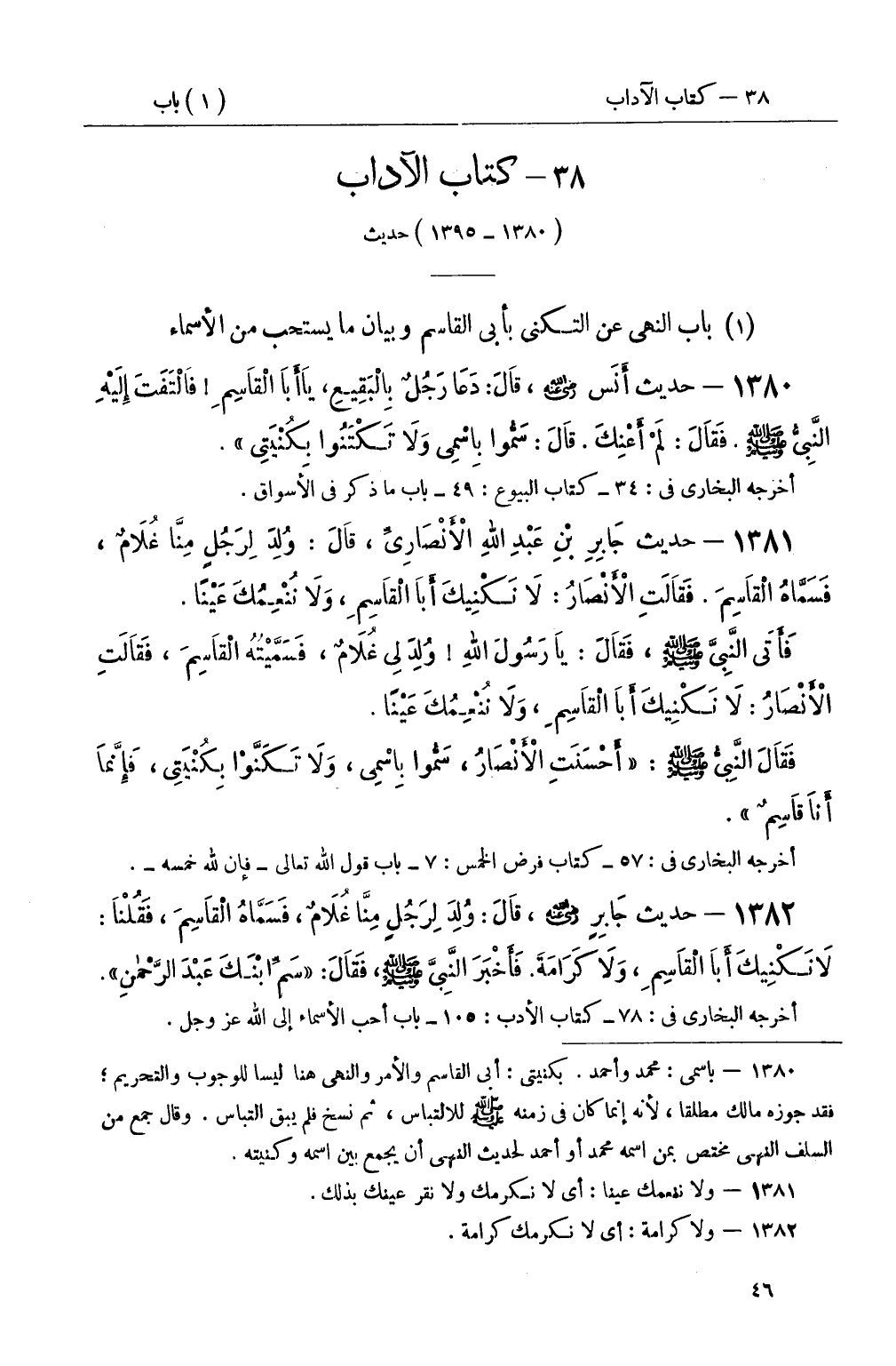 1382 - حديث جَابِرٍ رضي الله عنه، قَالَ: وُلِدَ لِرَجُلٍ مِنَّا غُلاَمٌ، فَسَمَّاهُ الْقَاسِمَ، فَقُلْنَا: لاَ نَكْنِيكَ أَبَا الْقَاسِمِ، وَلاَ كَرَامَةَ فَأَخْبَرَ النَّبِيَّ صَلَّى اللَّهُ عَلَيْهِ وَسَلَّمَ، فَقَالَ: سَمِّ ابْنَكَ عَبْدَ الرَّحْمنِ