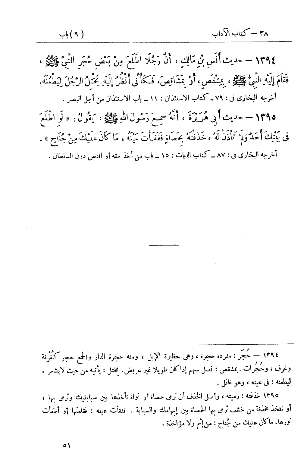 1394 - حديث أَنَسِ بْنِ مَالِكٍ، أَنَّ رَجُلاً اطَّلَعَ مِنْ بَعْضِ حُجَرِ النَّبِيِّ صَلَّى اللَّهُ عَلَيْهِ وَسَلَّمَ، فَقَامَ إِلَيْهِ النَّبِيُّ صَلَّى اللَّهُ عَلَيْهِ وَسَلَّمَ، بِمِشْقَصٍ، أَوْ بِمَشَاقِصَ، فَكَأَنِّي أَنْظُرُ إِلَيْهِ يَخْتِلُ الرَّجُلَ لِيَطعُنَهُ