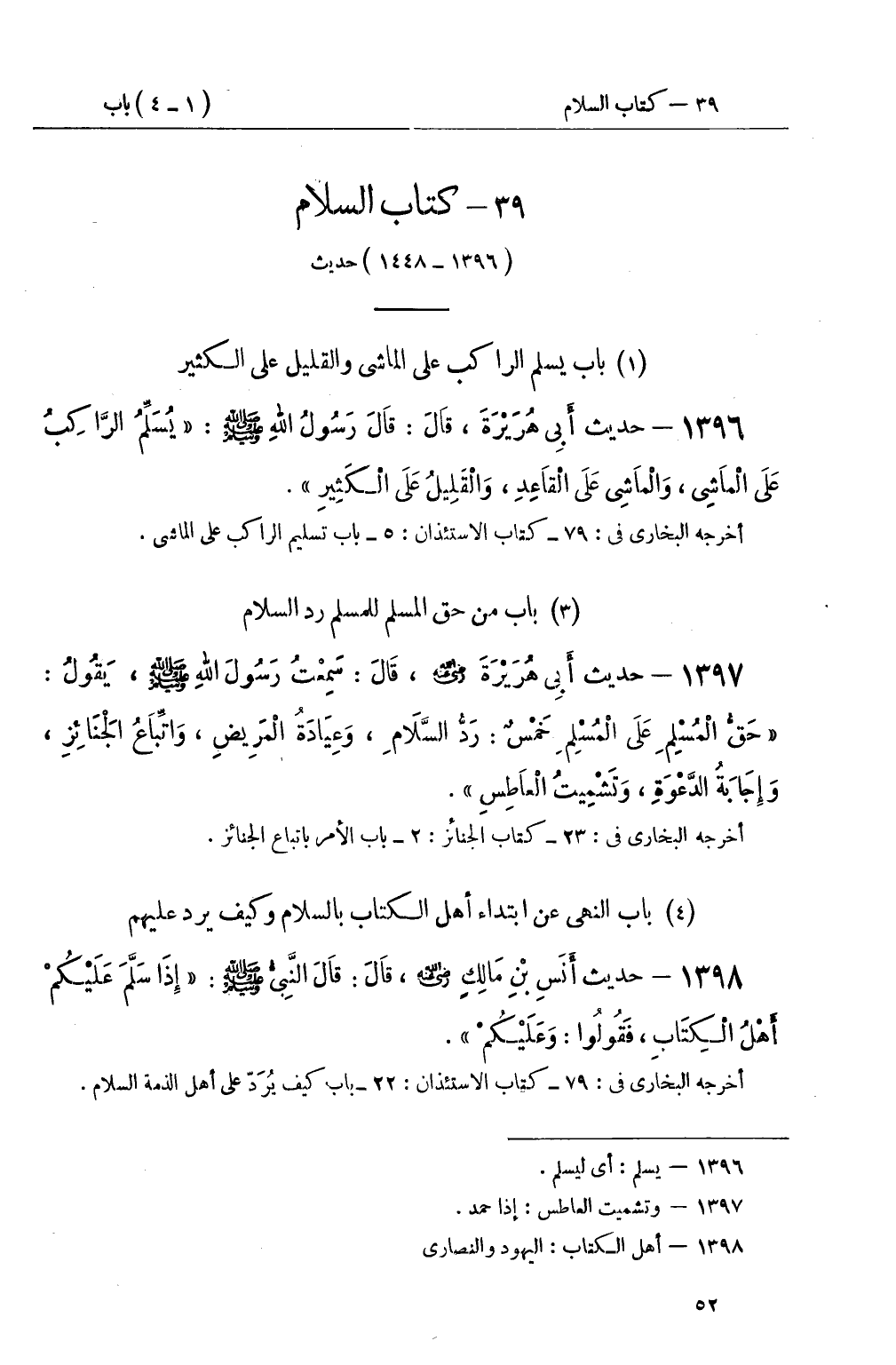 1396 - حديث أَبِي هُرَيْرَةَ، قَالَ: قَالَ رَسُولُ اللهِ صَلَّى اللَّهُ عَلَيْهِ وَسَلَّمَ: يُسَلِّمُ الرَّاكِبُ عَلَى الْمَاشِي، وَالْمَاشِي عَلَى الْقَاعِدِ، وَالْقَلِيلُ عَلَى الْكَثِيرِ