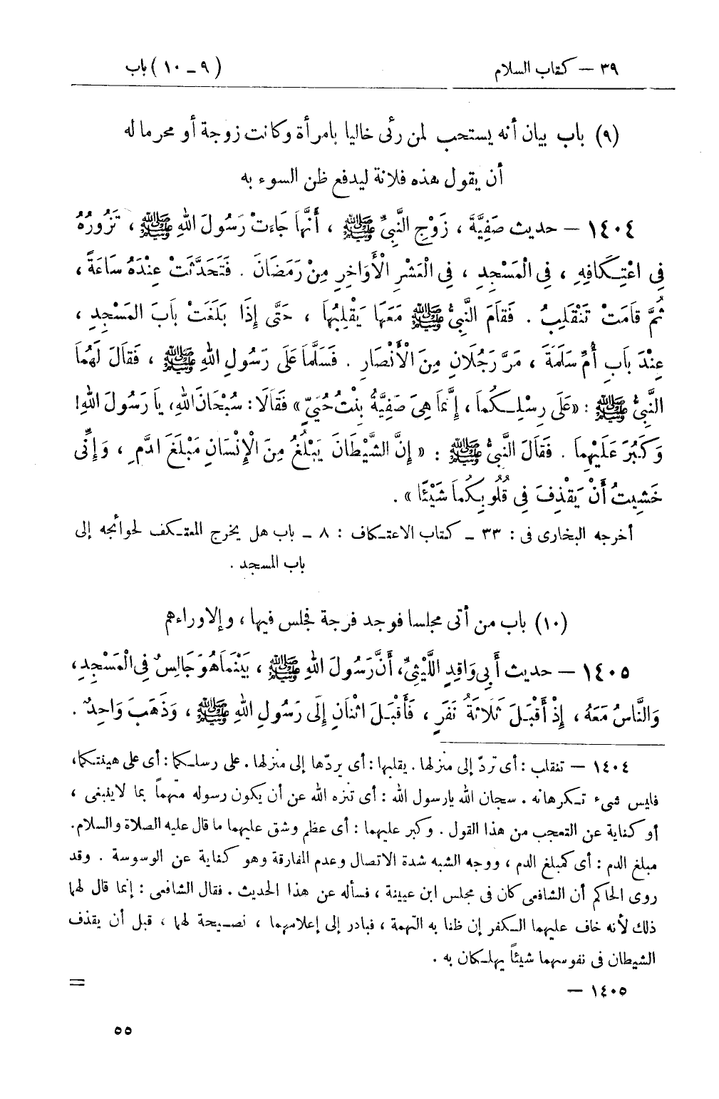 1404 - حديث صَفِيَّةَ، زَوْجِ النَّبِيِّ صَلَّى اللَّهُ عَلَيْهِ وَسَلَّمَ، أَنَّهَا جَاءَتْ رَسُولَ اللهِ صَلَّى اللَّهُ عَلَيْهِ وَسَلَّمَ، تَزُورُهُ فِي اعْتِكَافِهِ، فِي الْمَسْجِدِ، فِي الْعَشْرِ الأَوَاخِرِ مِنْ رَمَضَانَ فَتَحَدَّثَتْ عِنْدَهُ سَاعَةً، ثُمَّ قَامَتْ تَنْقَلِبُ فَقَامَ النَّبِيُّ صَلَّى اللَّهُ عَلَيْهِ وَسَلَّمَ مَعَهَا يَقْلِبُهَا، حَتَّى إِذَا بَلَغَتْ بَابَ المَسْجِدِ، عِنْدَ بَابِ أُمِّ سَلَمَةَ، مَرَّ رَجُلاَنِ مِنَ الأَنْصَارِ فَسَلَّمَا عَلَى رَسُولِ اللهِ صَلَّى اللَّهُ عَلَيْهِ وَسَلَّمَ، فَقَالَ لَهُمَا النَّبِيُّ صَلَّى اللَّهُ عَلَيْهِ وَسَلَّمَ: عَلَى رِسْلِكُمَا، إِنَّمَا هِيَ صَفِيَّةُ بِنْتُ حُيَيٍّ فَقَالاَ: سُبْحَانَ اللهِ، يَا رَسُولَ اللهِ وَكَبُرَ عَلَيْهِمَا فَقَالَ النَّبِيُّ صَلَّى اللَّهُ عَلَيْهِ وَسَلَّمَ: إِنَّ الشَّيْطَانَ يَبْلُغُ مِنَ الإِنْسَانِ مَبْلَغَ الدَّمِ، وَإِنِّي خَشِيْتُ أَنْ يَقْذِفَ فِي قُلُوبِكُمَا شَيْئًا