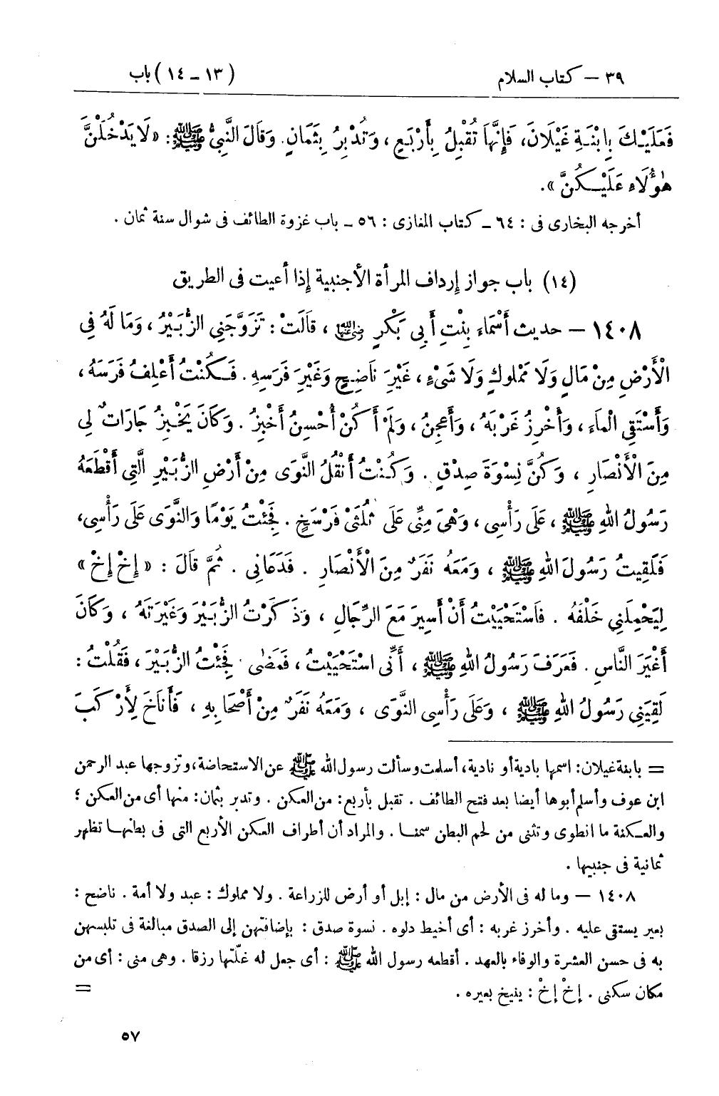 1408 - حديث أَسْمَاءَ بِنْتِ أَبِي بَكْرٍ، قَالَتْ: تَزَوَّجَنِي الزُّبَيْرُ، وَمَا لَهُ فِي الأَرْضِ مِنْ مَالٍ وَلاَ مَمْلوكٍ وَلاَ شَيْءٍ، غَيْرَ نَاضِجٍ وَغَيْرَ فَرَسِهِ فَكُنْتُ أَعْلِفُ فَرَسَهُ، وَأَسْتَقِي الْمَاءَ، وَأَخْرِزُ غَرْبَهُ، وَأَعجِنُ، وَلَمْ أَكُنْ أُحْسِنُ أَخْبِزُ وَكَانَ يَخْبِزُ جَارَاتٌ لِي مِنَ الأَنْصَارِ، وَكُنَّ نِسْوَةَ صِدْقٍ وَكُنْتُ أَنْقُلُ النَّوَى مِنْ أَرْضِ الزُّبَيْرِ الَّتِي أَقْطَعَهُ رَسُولُ اللهِ صَلَّى اللَّهُ عَلَيْهِ وَسَلَّمَ، عَلَى رَأْسِي، وَهِيَ مِنِّي عَلَى ثُلثَيْ فَرْسَخٍ فَجِئْتُ يَوْمًا وَالنَّوَى عَلَى رَأسِي، فَلَقِيتُ رَسُولَ اللهِ صَلَّى اللَّهُ عَلَيْهِ وَسَلَّمَ، وَمَعَهُ نَفَرٌ مِنَ الأَنْصَارِ فَدَعَانِي ثُمَّ قَالَ: إِخْ إِخْ لِيَحْمِلَنِي خَلْفَهُ فَاسَتَحْيَيْتُ أَنْ أَسِيرَ مَعَ الرِّجَالِ، وَذَكَرْتُ الزُّبَيْرَ وَغَيْرَتَهُ، وَكَانَ أَغْيَرَ النَّاسِ فَعَرَفَ رَسُولُ اللهِ صَلَّى اللَّهُ عَلَيْهِ وَسَلَّمَ، أَنِّي اسْتَحْيَيْتُ، فَمَضى فَجِئْتُ الزُّبَيْرَ، فَقُلْتُ: لَقِيَنِي رَسُولُ اللهِ صَلَّى اللَّهُ عَلَيْهِ وَسَلَّمَ، وَعَلَى رَأْسِي النَّوَى، وَمَعَهُ نَفَرٌ مِنْ أَصْحَابِهِ، فَأَنَاخَ لأَرْكَبَ -[58]- فَاسْتَحْيَيْتُ مِنْهُ، وَعَرَفْتُ غَيْرَتَكَ فَقَالَ: وَاللهِ لَحَمْلُكِ النَّوَى كَانَ أَشَدَّ عَلَيَّ مِنْ رُكُوبِكِ مَعَهُ قَالَتْ: حَتَّى أَرْسَلَ إِلَيَّ أَبُو بَكْرٍ، بَعْدَ ذَلِكَ، بِخَادِمٍ يَكْفِينِي سِيَاسَةَ الْفَرَسِ، فَكَأَنَّمَا أَعْتَقَنِي