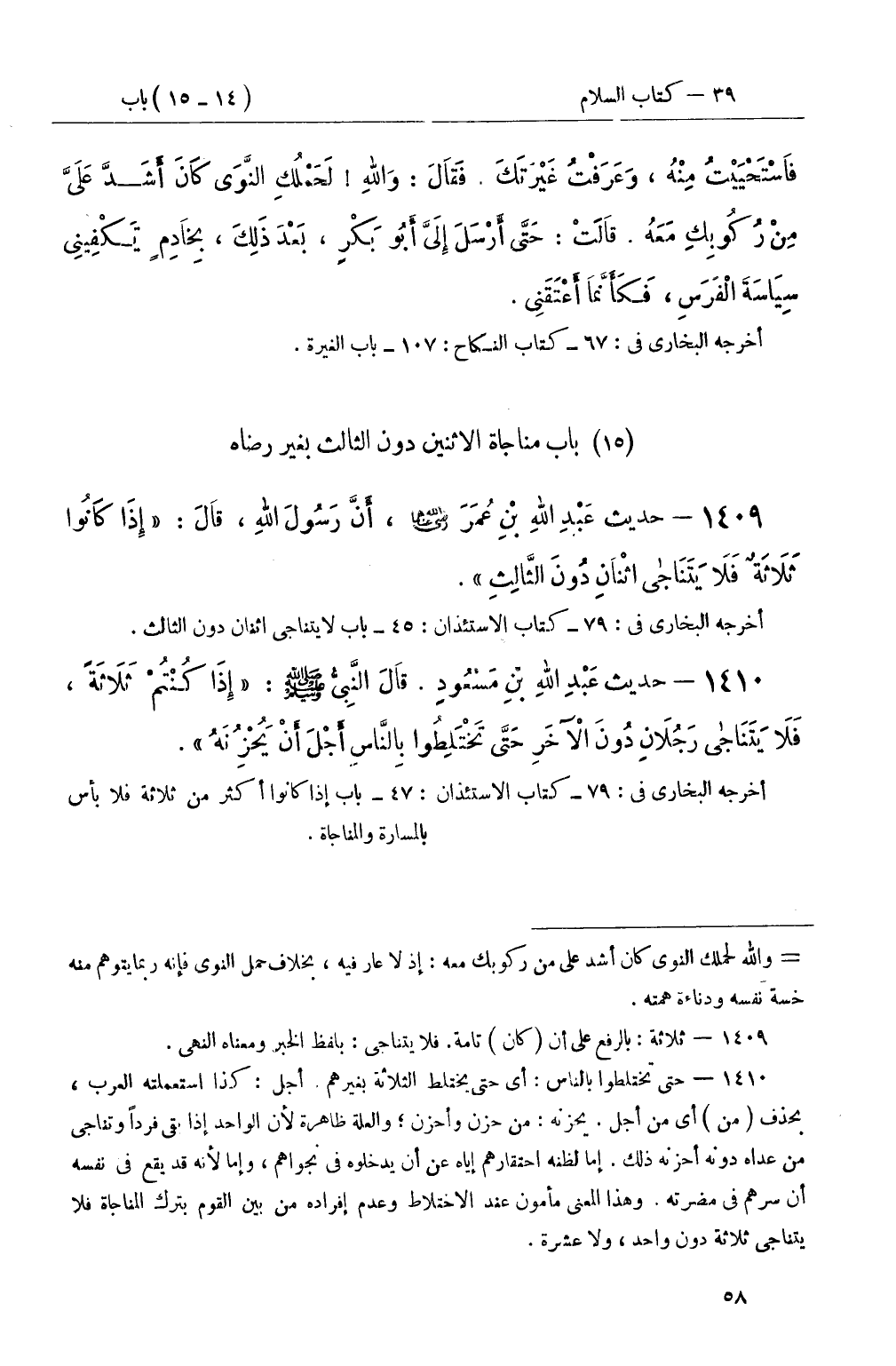 1410 - حديث عَبْدِ اللهِ بْنِ مَسْعُودٍ قَالَ النَّبِيُّ صَلَّى اللَّهُ عَلَيْهِ وَسَلَّمَ: إِذَا كُنْتُمْ ثَلاَثَةً، فَلاَ يَتَنَاجى رَجُلاَنٍ دُونَ الآخَرِ حَتَّى تَخْتَلِطُوا بِالنَّاسِ أَجْلَ أَنْ يُحْزِنَهُ