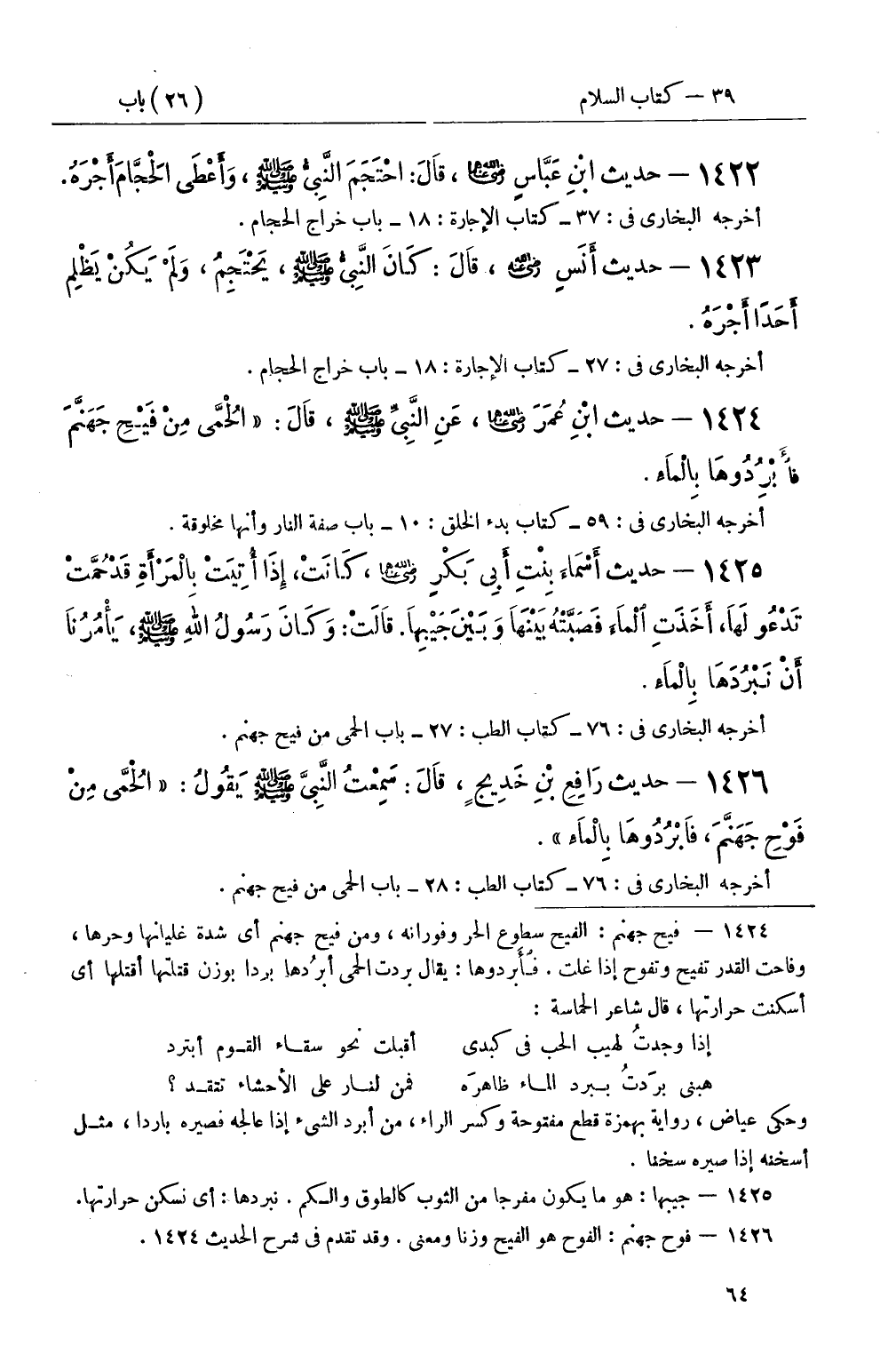 1426 - حديث رَافِعِ بْنِ خَدِيجٍ، قَالَ: سَمِعْتُ النَّبِيَّ صَلَّى اللَّهُ عَلَيْهِ وَسَلَّمَ يَقُولُ: الْحُمَّى مِنْ فَوْحِ جَهَنَّمَ، فَابْرُدُوهَا بِالْمَاءِ