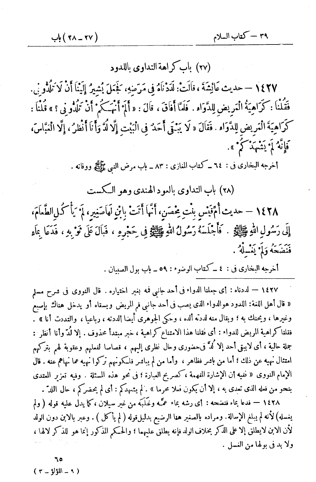 1427 - حديث عَائِشَةَ، قَالَتْ: لَدَدْنَاهُ فِي مَرَضِهِ، فَجَعَلَ يُشِيرُ إِلَيْنَا أَنْ لاَ تَلُدُّونِي فَقُلْنَا: كَرَاهِيَةُ الْمَرِيضِ لِلدَّوَاءِ فَلَمَّا أَفَاقَ، قَالَ: أَلَمْ أَنْهَكُمْ أَنْ تَلدُّونِي قُلْنَا: كَرَاهِيَةَ الْمَرِيضِ لِلدَّوَاءِ فَقَالَ لاَ يَبْقَى أَحَدٌ فِي الْبَيْتِ إِلاَّ لُدَّ وَأَنَا أَنْظرُ، إِلاَّ الْعَبَّاسَ، فَإِنَّهُ لَمْ يَشْهَدْكُمْ