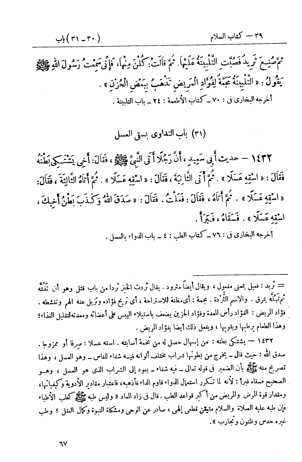 1432 - حديث أَبِي سَعِيدِ، أَنَّ رَجُلاً أَتَى النَّبِيَّ صَلَّى اللَّهُ عَلَيْهِ وَسَلَّمَ، فَقَالَ: أَخِي يَشْتَكِي بَطْنَهُ فَقَالَ: اسْقِهِ عَسَلاً ثُمَّ أَتى الثَّانِيَةَ، فَقَالَ: اسْقِهِ عَسَلاً ثُمَّ أَتَاهُ الثَّالِثَةَ، فَقَالَ: اسْقِهِ عَسَلاً ثُمَّ أَتَاهُ، فَقَالَ: فَعَلْتُ فَقَالَ: صَدَقَ اللهُ وَكَذَبَ بَطْنُ أَخِيكَ، اسْقِهِ عَسَلاً فَسَقَاهُ، فَبَرَأَ