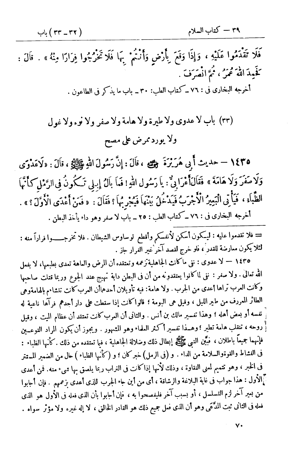 1435 - حديث أَبِي هُرَيْرَةَ رضي الله عنه، قَالَ: إِنَّ رَسُولَ اللهِ صَلَّى اللَّهُ عَلَيْهِ وَسَلَّمَ، قَالَ: لاَ عَدْوَى وَلاَ صَفَرَ وَلاَ هَامَةَ فَقَالَ أَعْرَابِيٌّ: يَا رَسُول اللهِ فَمَا بَالُ إِبِلِي تَكُونُ فِي الرَّمْلِ كَأنَّهَا الظِّبَاءُ، فَيَأْتِي الْبَعِيرُ الأَجْرَبُ فَيَدْخُلُ بَيْنَهَا فَيُجْرِبُهَا فَقَالَ: فَمَنْ أَعْدَى الأَوَّلَ
