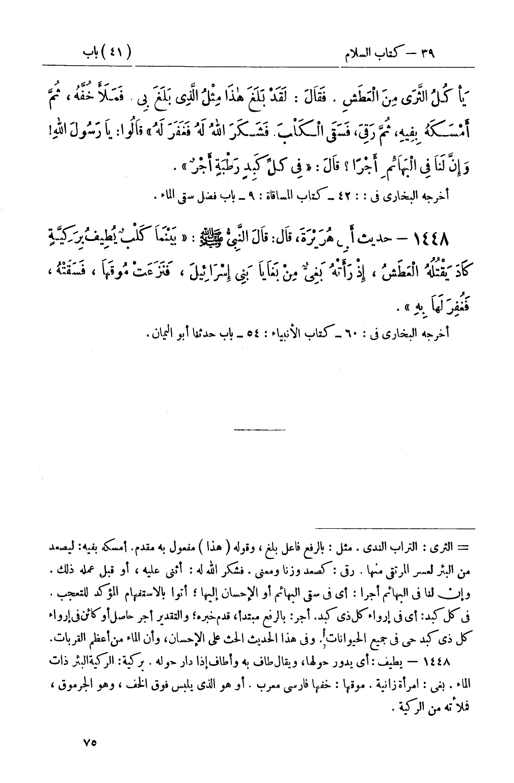1448 - حديث أَبِي هُرَيْرَةَ، قَالَ: قَالَ النَّبِيُّ صَلَّى اللَّهُ عَلَيْهِ وَسَلَّمَ: بَيْنَمَا كَلْبٌ يُطِيفُ بِرَكِيَّةٍ كَادَ يَقْتُلُهُ الْعَطَشُ، إِذْ رَأَتْهُ بَغِيٌّ مِنْ بَغَايَا بَنِي إِسْرَائِيلَ، فَنَزَعَتْ مُوقَهَا، فَسَقَتْهُ، فَغُفِرَ لَهَا بِهِ