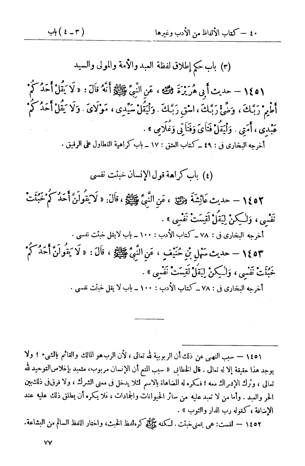 1451 - حديث أَبِي هُرَيْرَةَ رضي الله عنه، عَنِ النَّبِيِّ صَلَّى اللَّهُ عَلَيْهِ وَسَلَّمَ أَنَّهُ قَالَ: لاَ يَقُلْ أَحَدُكُمْ أَطْعِمْ رَبَّكَ، وَضِّى رَبَّكَ، اسْقِ رَبَّكَ وَلْيَقُلْ سَيِّدِي، مَوْلاَيَ وَلاَ يَقُلْ أَحَدُكُمْ عَبْدِي، أَمَتِي وَلْيَقُلْ فَتَايَ وَفَتَاتِي وَغُلاَمِي