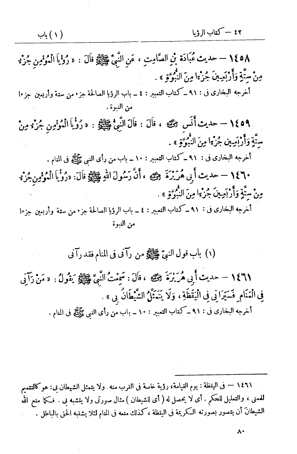 1460 - حديث أَبِي هُرَيْرَةَ رضي الله عنه، أَنَّ رَسُولَ اللهِ صَلَّى اللَّهُ عَلَيْهِ وَسَلَّمَ قَالَ: رُؤْيَا الْمُؤْمِنِ جُزْءٌ مِنْ سِتَّةٍ وَأَرْبَعِينَ جُزْءًا مِنَ النُّبُوَّةِ