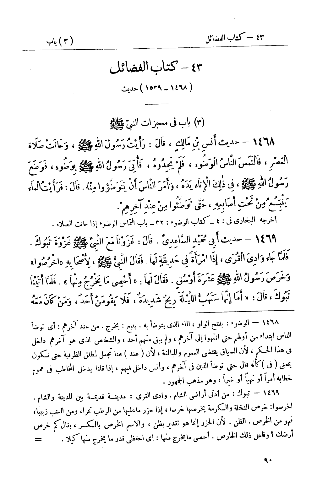 1468 - حديث أَنسِ بْنِ مَالِكٍ، قَالَ: رَأَيْتُ رَسُولَ اللهِ صَلَّى اللَّهُ عَلَيْهِ وَسَلَّمَ، وَحَانَتْ صَلاَة الْعَصْرِ، فَالْتَمَسَ النَّاسُ الْوَضُوءَ، فَلَمْ يَجِدُوهُ، فَأُتِيَ رَسُولُ اللهِ صَلَّى اللَّهُ عَلَيْهِ وَسَلَّمَ بِوَضُوءٍ، فَوَضَعَ رَسُولُ اللهِ صَلَّى اللَّهُ عَلَيْهِ وَسَلَّمَ، فِي ذلِكَ الإِنَاءِ يَدَهُ، وَأَمَرَ النَّاسَ أَنْ يَتَوَضَّؤُوا مِنْهُ قَالَ: فَرَأَيْتُ الْمَاءَ يَنْبَعُ مِنْ تَحْتِ أَصَابِعِهِ، حَتَّى تَوَضَّؤُوا مِنْ عِنْدَ آخِرِهِمْ